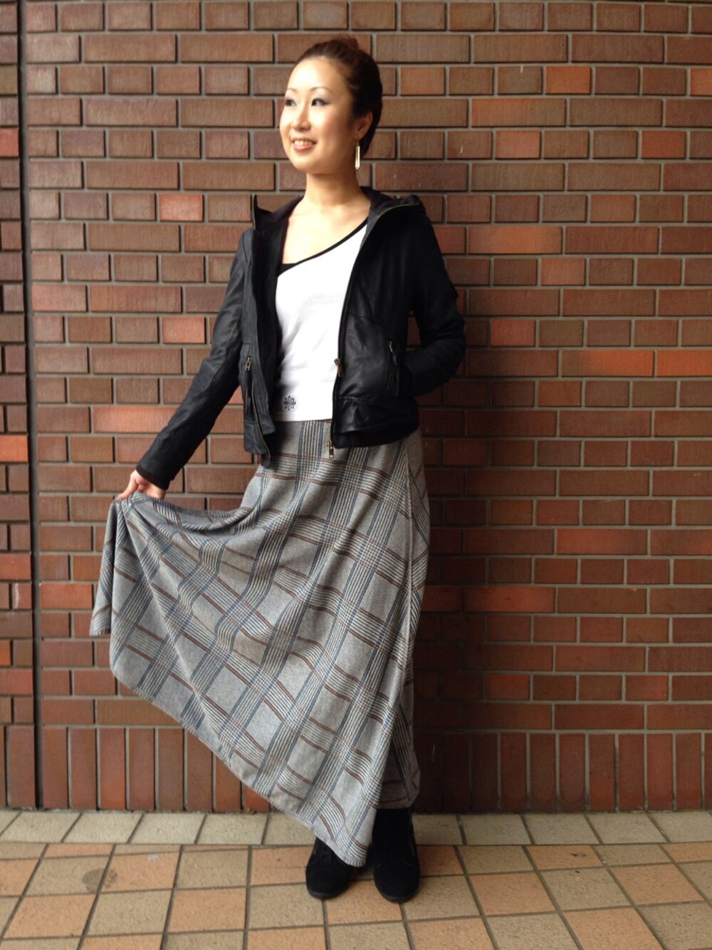 ボリュームのあるフードがポイントのレザージャケットと、ビッグチェック柄のロングスカートで、秋の装いの出来上がり!