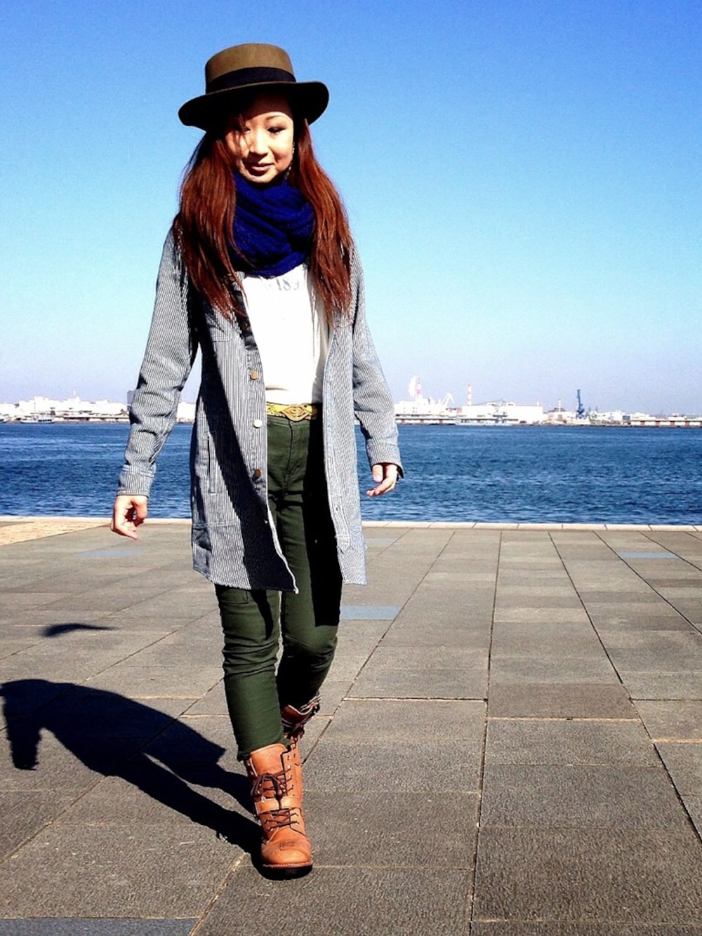 ジャケットとしても着用出来るシャツワンピース、首元&足元にボリュームを出して、季節感を出したコーディネートです!