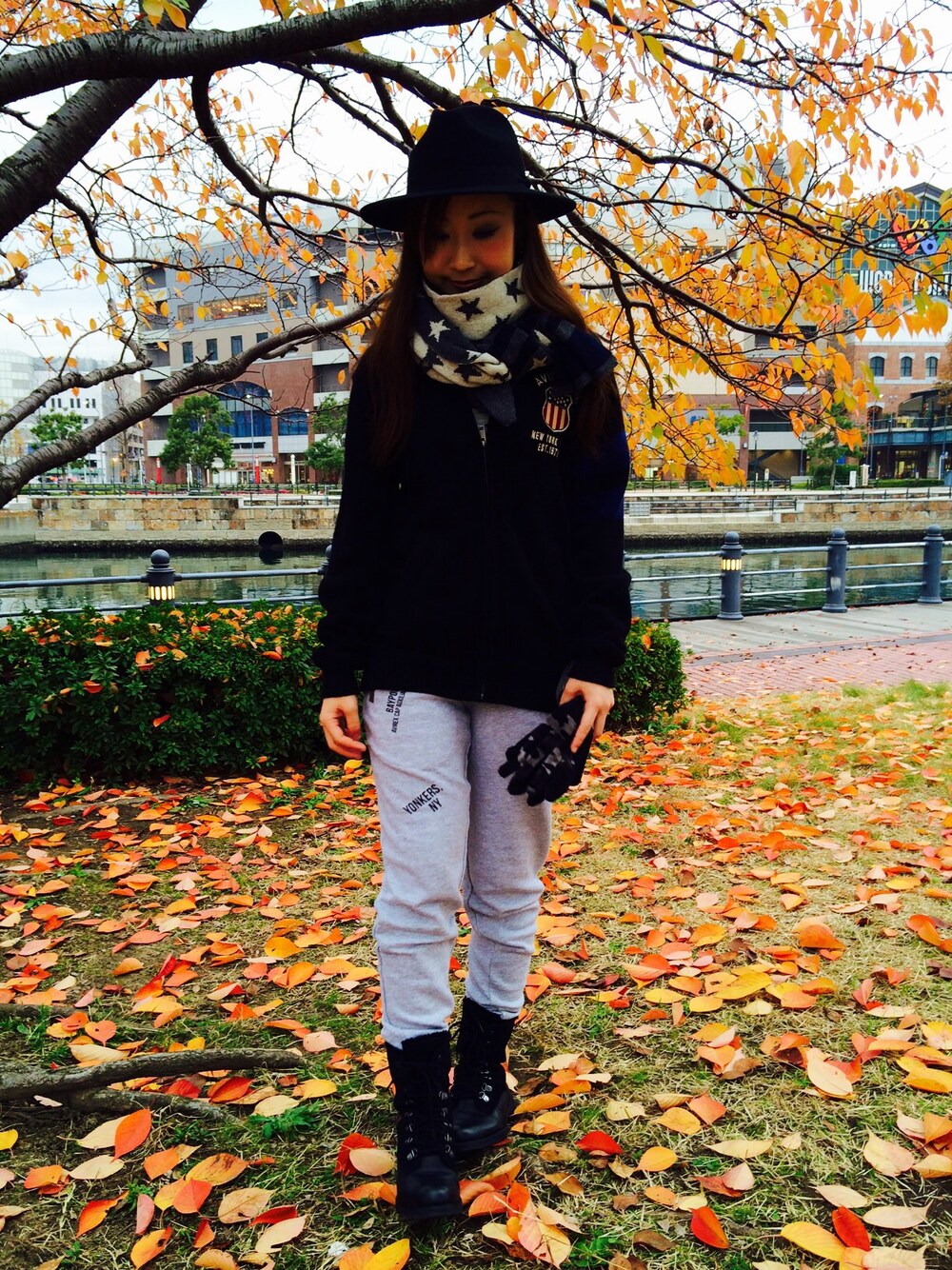 スウェットパンツでお散歩の日は、マフラーと手袋で、小物を冬仕様に。