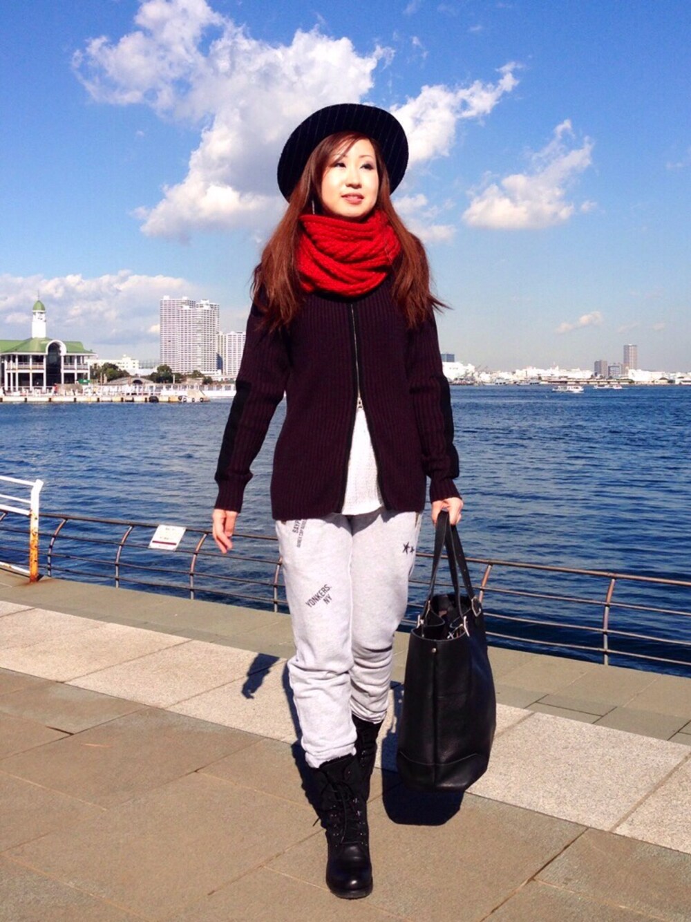 黒ニットには、スヌードで明るさをプラスして!