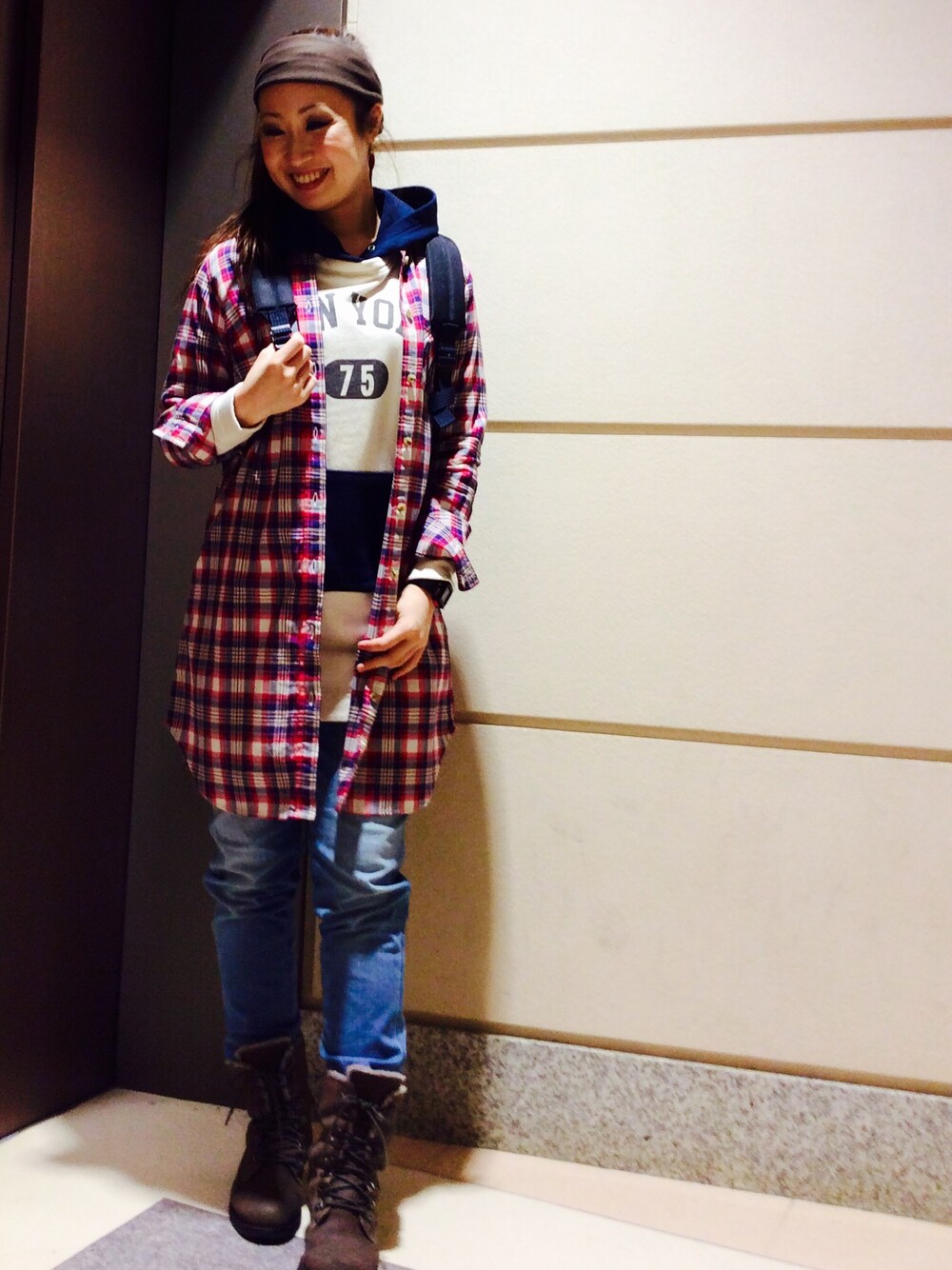 デニム✖️チェックシャツ✖️パーカーで、カジュアル王道スタイルです!