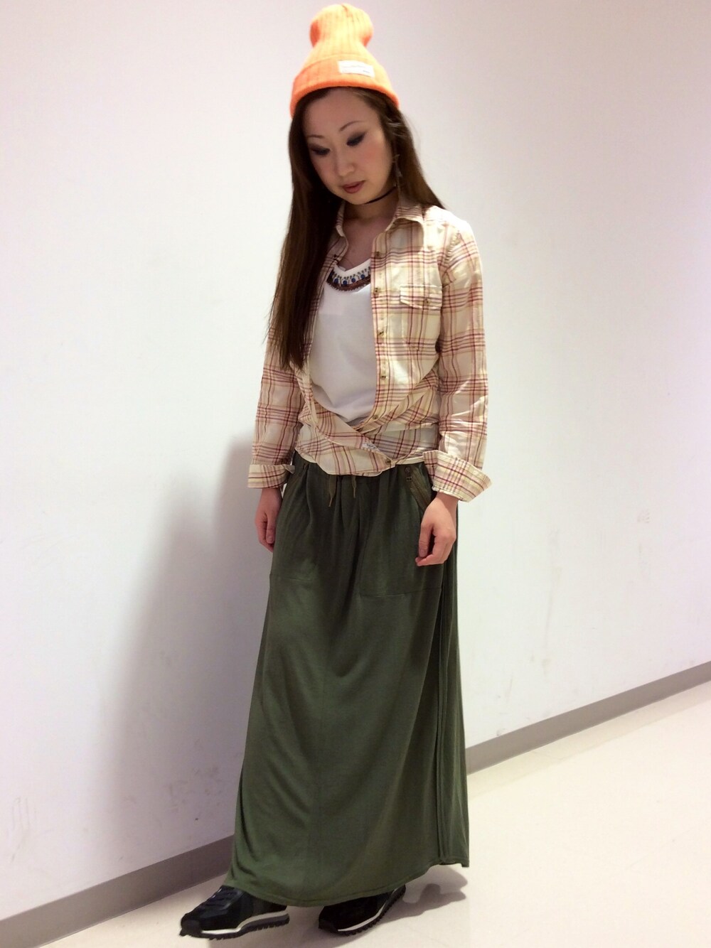 チェックシャツをカシュクールにして柔らかさを出したコーディネートです!