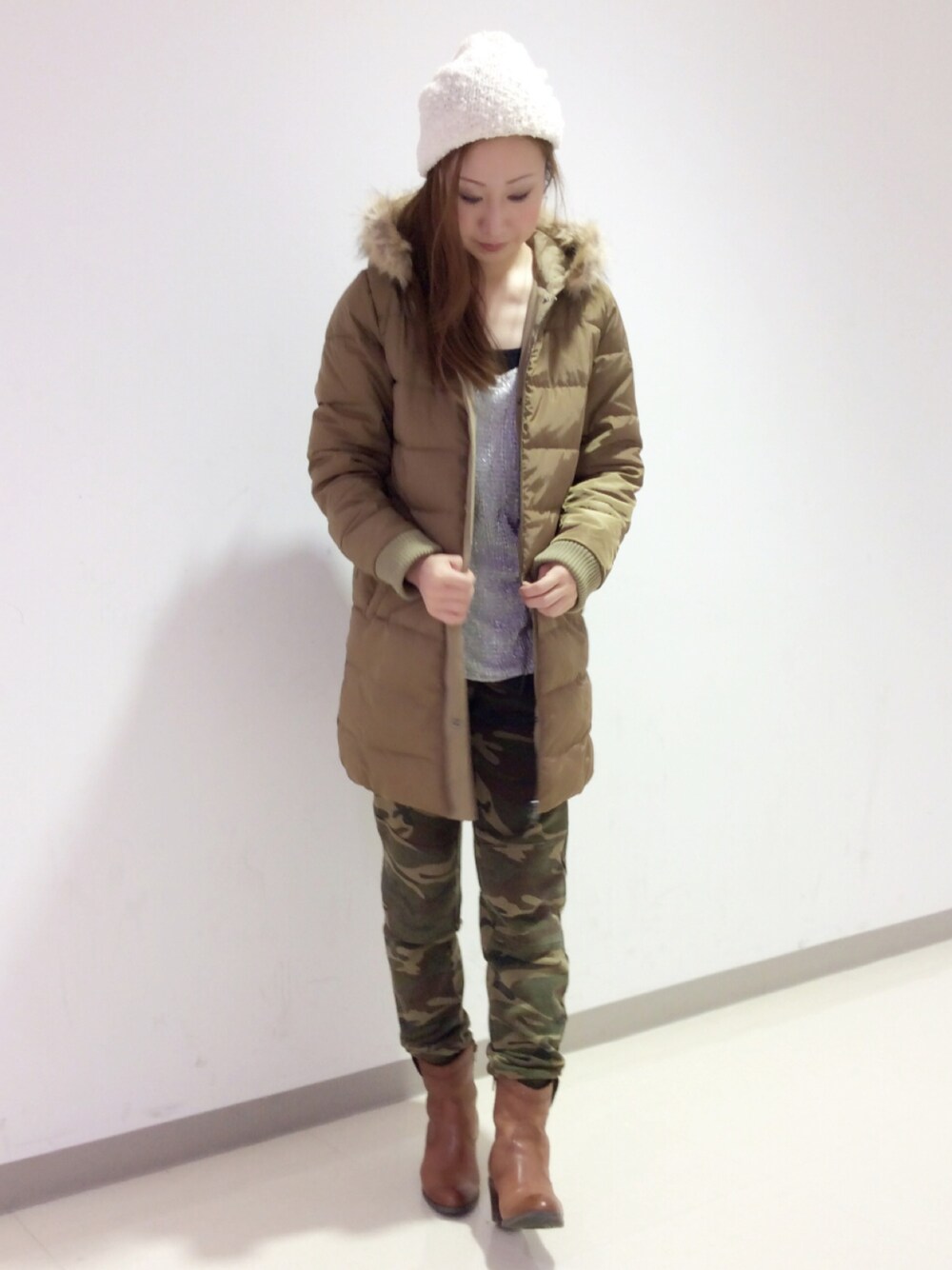 リバーシブルのミリタリーコートにカモ柄スウェットで、ラクチンコーデ!