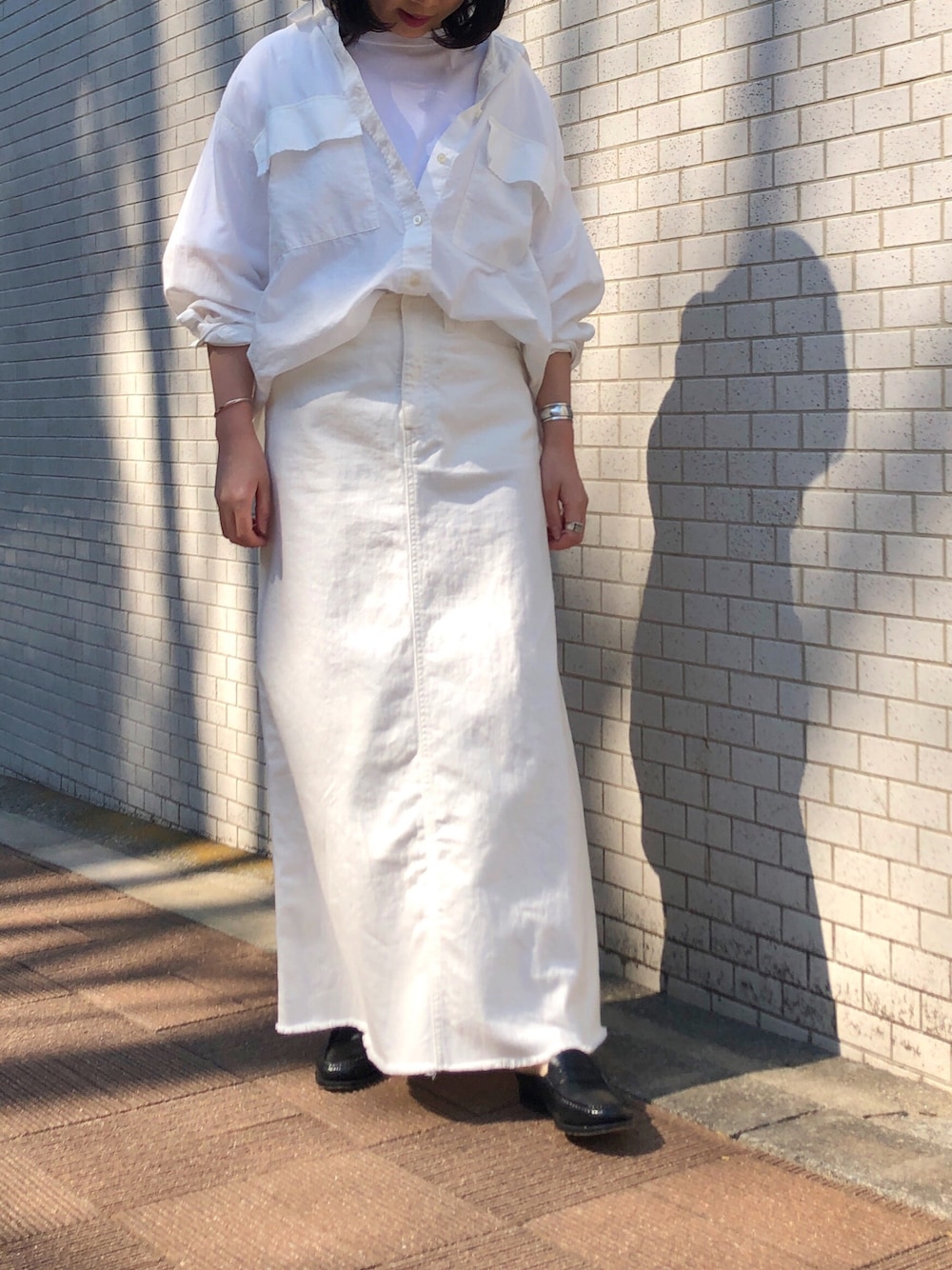 春夏はwhiteでまとめたくなります🥛🥚☁️🌫 ホワイトデニムスカートは、後ろにまちがあるので後ろがフレアっぽいので、前後で雰囲気が違うところが気に入ってます☺️ 足さばきもよい!! Instagram:terai_munich
