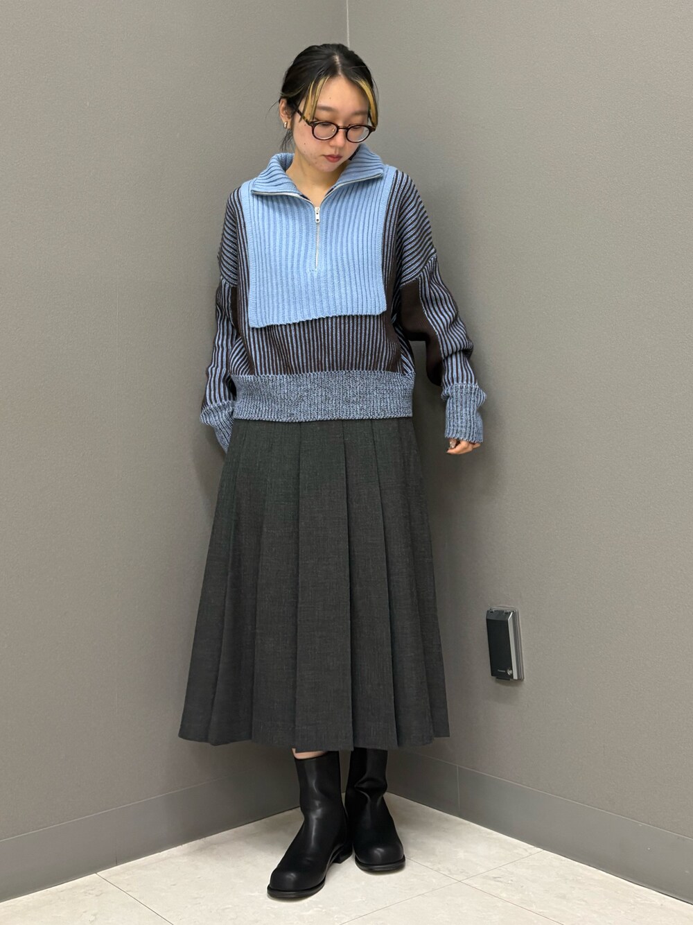 動きが綺麗なプリーツスカートにハーフジップのニットを合わせて綺麗目レトロスタイルにしてみました! オシャレ・大人は綺麗めブーツやヒール合わせ、ヤング・カジュアル・ガーリーはスニーカーや厚底、パンツをレイヤードしても可愛いです!! どのアイテムも色んな世代の方に楽しんでいただけるので、ぜひお試しください♪