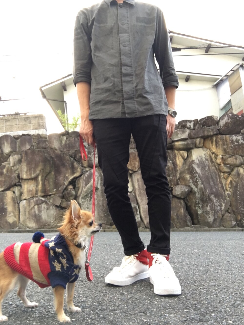 undercoverのダーツパンツが優秀過ぎてこれしか履いてない( ¨̮ ) ネル様との散歩。
