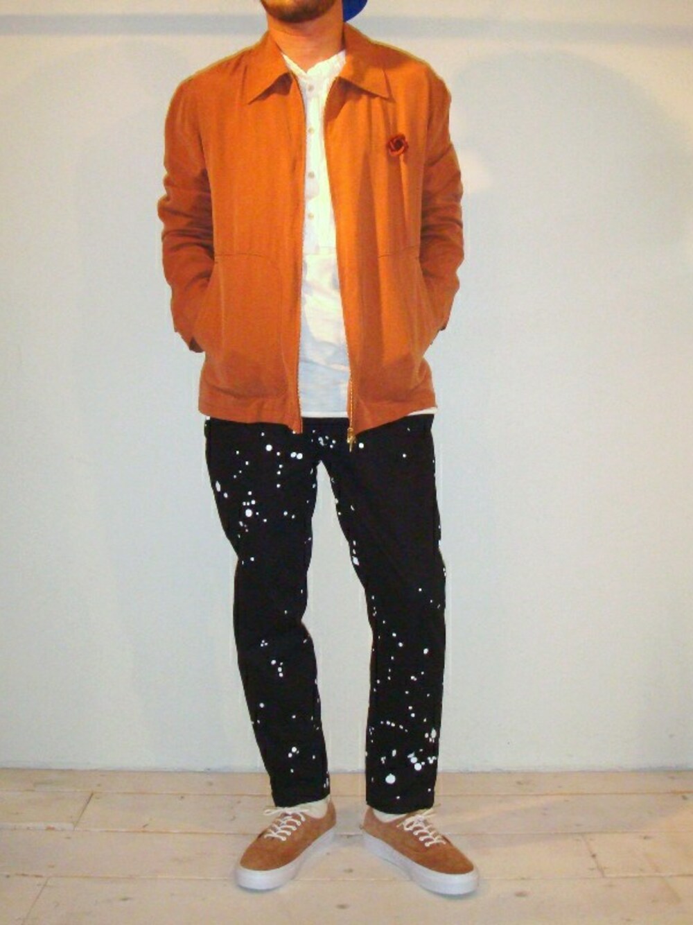 THREE BLIND MICEに別注をかけたドリズラーを使ったコーデ。 TOPSが少し主張の強いカラ―なので、 インナーとボトムはモノトーンで統一感を持たせています。 上は、ややゆったりめ、パンツはやや細身のテーパードシルエットで、 シャープにしたネオストリートスタイル。