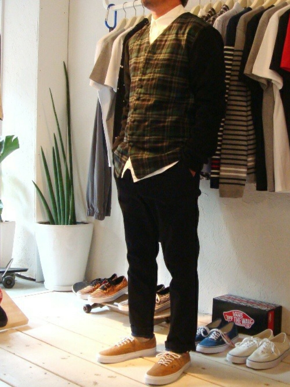 ☆TOPS/Enharmonic TAVERN/LSD-13AW-S002/コンビネーションカーデシャツ /\25,200-(Tax in) http://terroir-shop.com/brand/tavern/lsd-13aw-s002.html ☆INNER/GOODENOUGH/GE-133010/GE CAMO BUTTON FLY CALLAR SHIRT /\18,900-(Tax in) http://terroir-shop.com/brand/goodenough/ge-133010.html ☆BOTTOM/THREE BLIND MICE/B-5039/ヨコカラー11.5oz S.デニムアンクルテーパードPT /\18,900- http://terroir-shop.com/brand/threeblindmice/b-5039.html ☆SHOES/VANS CALIFORNIA/VN-0L9O8I/AUTHENTIC DECON CA /\8,925-(Tax in) http://terroir-shop.com/brand/vans/vn-0l9o8i.html ようやく朝晩は、ぐーっと涼しくなって参りました。 秋物のイメージが出てきているのでは無いでしょうか? 先週末に新作が色々と入荷してきましたので、色使いも含め秋らしいコーデを。 エンハーモニックタバーンより入荷した少し変わりダネアイテム。 身頃は、起毛掛ったネル系のマッドなチェック地を使用ており 裾のカッティングも含めジレの様な使用になっています。(背部にもベルト付き) 袖は、ウールとアクリルを混紡したニットソー素材で、 一見、ニットの上にジレを着ているように見える技有りなアイテムです。 一応、アイテム的にはカーデに含まれると思います。 それに白シャツ+マッドなインディゴ色のアンクルカットテーパードDENIMを 合わせた正統派なコーデに仕上げております。 細身系のボトムも合うのですが、この上下のバランスが現代っぽいのではと思います。 これから入荷してきますが、今期はチェスターコートやテーラードJKT等のVゾーンに シャツの代わりにタートルネックニットもお勧めです。 アイテムの詳細は、上記のリンクからご覧下さい。 レイヤードをせずに1枚着ただけで、完成される便利アイテムは如何でしょうか?