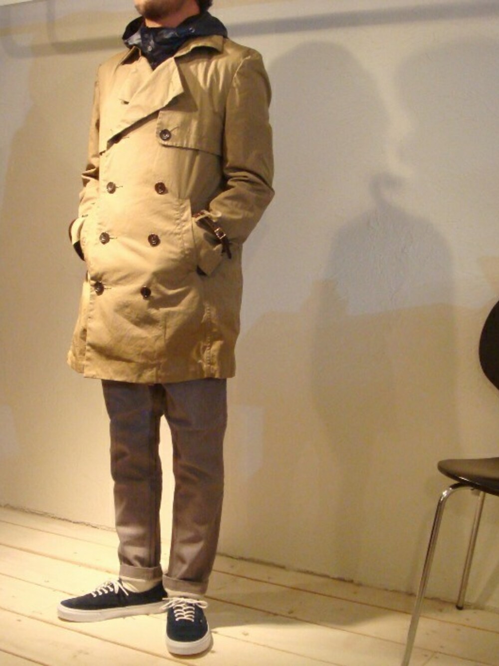 ☆OUTER/Enharmonic TAVERN/LSD-13AW-C001/Wガンフラップトレンチ /¥51、450- http://terroir-shop.com/brand/tavern/lsd-13aw-c001.html ☆INNER/Bernabeu/BER-3C-O1022/高密度シャンブレーツイルミックスアップパーカー /¥29、400- http://terroir-shop.com/brand/bernabeu/ber_3c_o1022.html ☆BOTTOM/THREE BLIND MICE/E-1017/別注ストレッチデニムアンクルカットテーパードPT/ ¥18、900- http://terroir-shop.com/brand/threeblindmice/e-1017.html ☆SHOES/VANS CALIFORNIA/VN-0L9O8I/AUTHENTIC DECON CA /¥8、925- http://terroir-shop.com/brand/vans/vn-0l9o8i.html 9月も中盤が過ぎ夜は、流石に半袖では厳しくなってきました。 店内も今週から少し重めのアウターの入荷が始まって参りました。 そのタイミングで、こちら”Enharmonic TAVERN""のトレンチコートを使用した コーデをご紹介させて頂きます。 こちらのコートはただのトレンチコートでは御座いません。 アイデンティテーが沢山詰まっております。 まずは、着丈。本来、トレンチと言えばロングが代名詞ですが、 ロングが苦手な方やカッチリし過ぎていて着ずらい等、懸念してきた方が多いはずです。 コレは、それを土返しするコート。着丈は、モモくらいに設定。 体型を選びません。さらに製品にてWASHをかけシーム部に強めのパッカリングが 入っていますので、適度なカジュアル感が+されています。 デザイン面ですが、通常片側のみに付くガンフラップが2つ付いていたり 今シーズンのアイコンであるレザーベルトが、袖口に2重巻きと 通常、共生地のベルトが付いてますが、その代わりにレザーベルトを装備。 こちらは、単なる付属ではなくアジャスト出来る仕様になっており 絞った際にAラインを描くのもポイントです。 CAMO+LEOPARDで切替えた裏地を採用しております。 ポケットも腰のハンドウォーマーの他、PTのポケットにそのまま手を入れられる スロテッドポケットも装備。見た目だけではなくトレンチコートの本格的な仕様も 再現しています。カジュアルコーデは勿論ですが、 袖幅や身幅にゆとりを持たせておりスーツの上からも着れますので、 幅広いシーンで活躍する1着です。 詳細は、上記のリンクよりご覧下さい。 是非、店頭にてご試着してみて下さい。