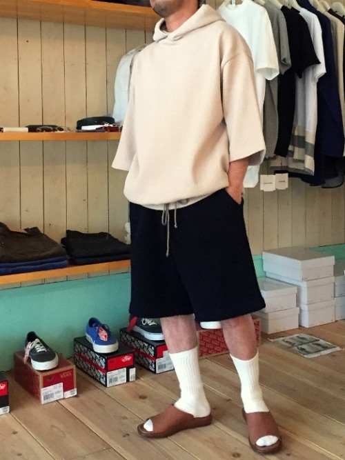 crepusculeでは、お馴染みのKANOKO編みを使用したシリーズ。 TOPSは、ドロップショルダーで7分袖のBIGシルエットが特徴的な KNITパーカー。サイドシームポケットや裾に配したドローコードにより 着丈を調整出来るのもポイントです。 深めの股上や全体的にゆったりとしたリラックス感のあるイージーショーツ。 やはりKNITということで全体的に上品な見え方になります。 素材もコットン100%なので選択が可能です。 鹿の子編みなので通気性も良くこれからの季節にも快適に着用頂けます。