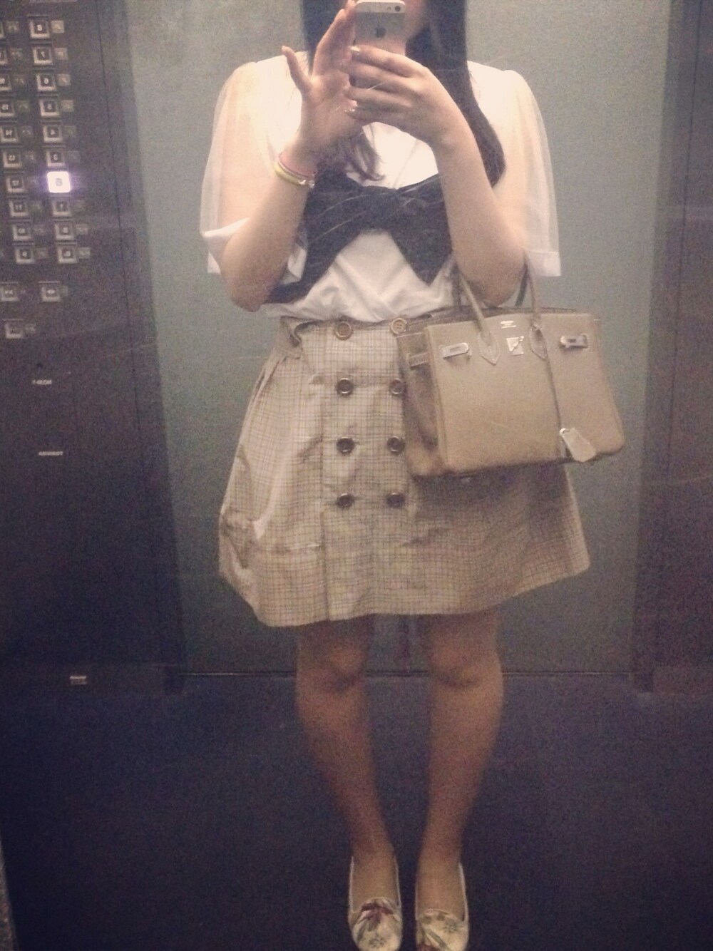today's outfit♥︎ トップスの袖の透け感がすき☻ リボン×スカートで女の子らしく。