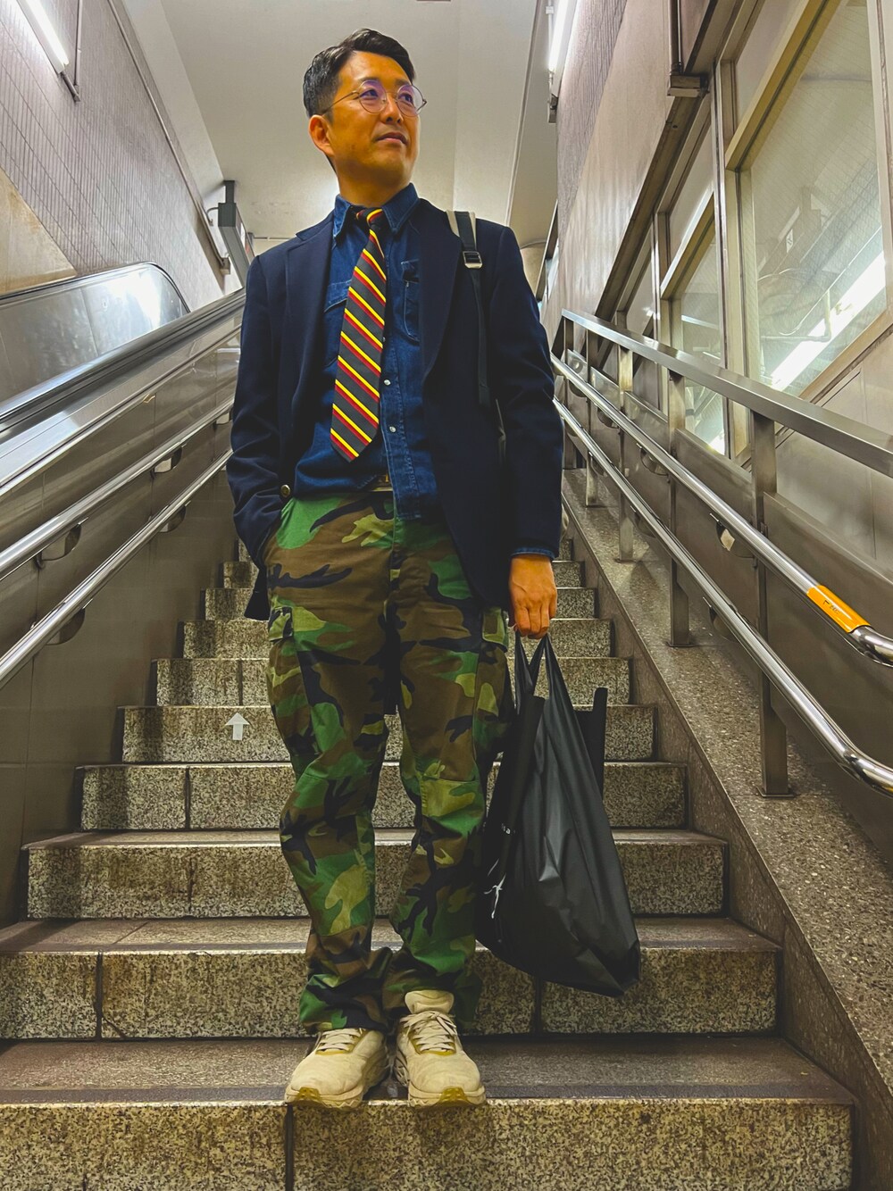 ミリタリーパンツと紺ブレは相性良いと思います。本当は革靴を履きたかったけど、雨なのでゴアテックスのホカ。