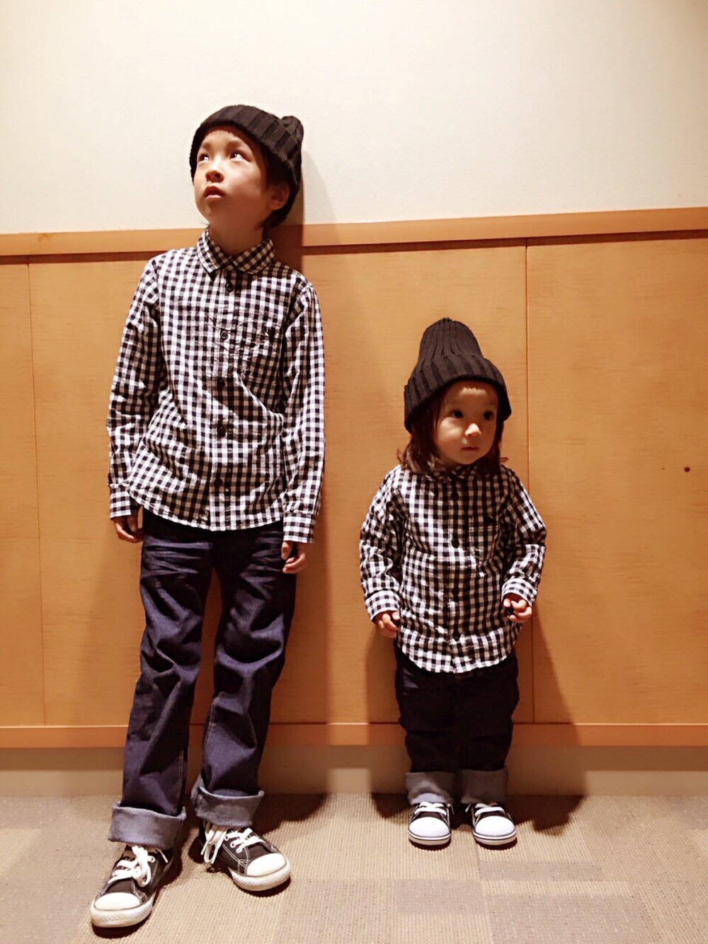今日は兄妹お揃いコーデにしました。デニムのバックポケットには白のペイントがされていて可愛いです。外ではカーキのミリタリーコートを着させましたー