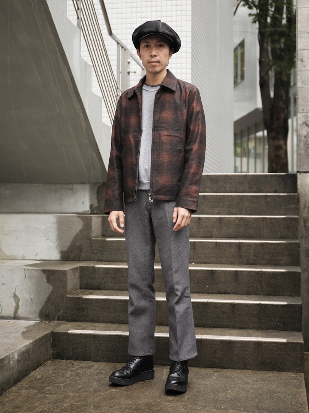 手嶋 祐生のブルゾン「BACK SATIN VINATGE OMBRE CHECK / RING ZIP BLOUSON」を使ったコーディネート