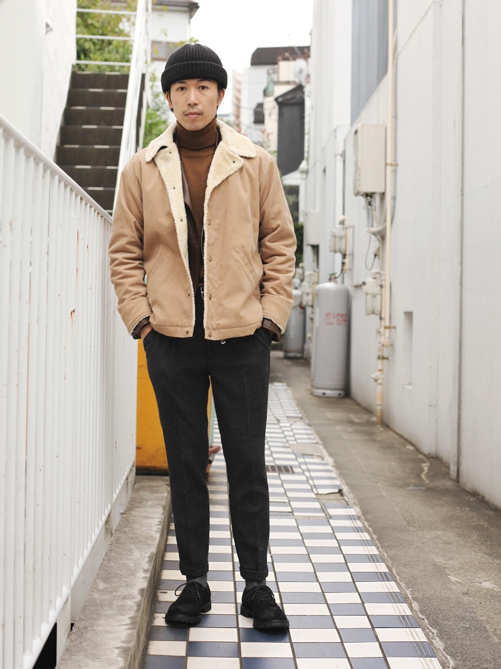 手嶋 祐生のピーコート「14W T/C CORDUROY × BOA / DOT BOTTON SHORT RANCH COAT」を使ったコーディネート
