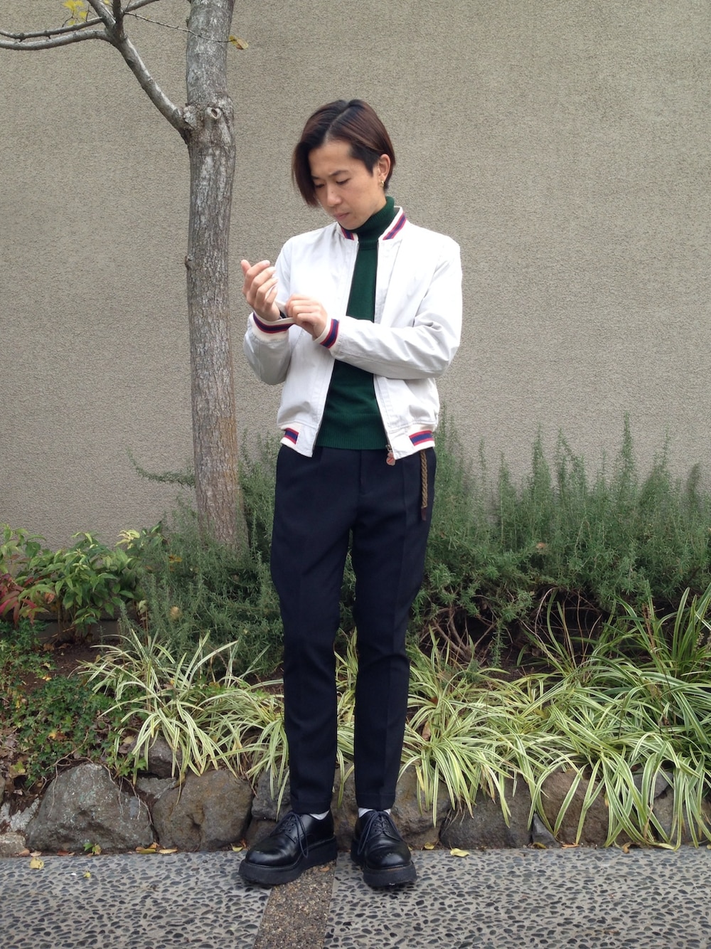手嶋 祐生のニット/セーター「12G CABLE×PLAINSTITCH KNIT / TURTLE NECK SWEATER」を使ったコーディネート