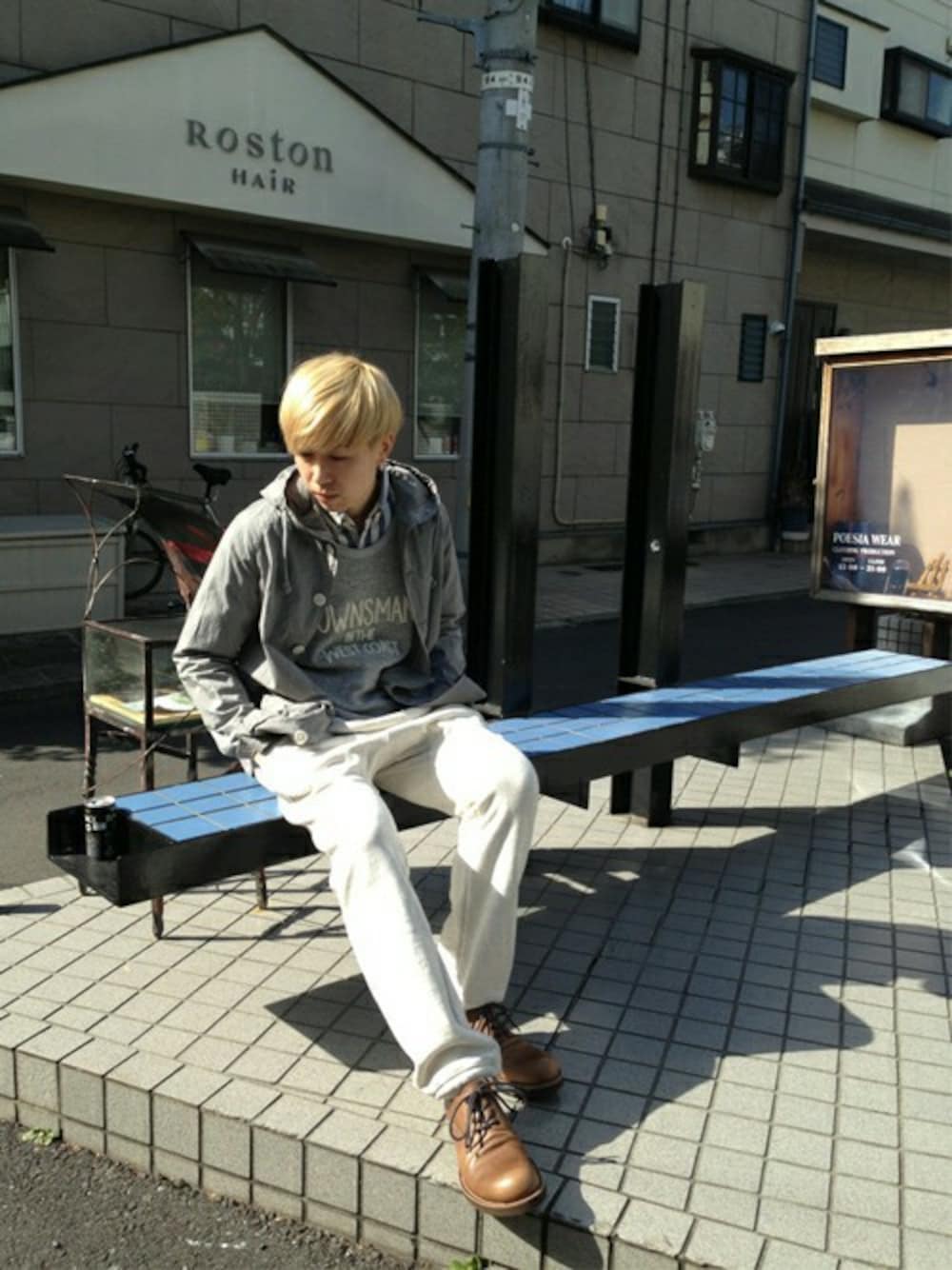 スエットパンツにブーツを合わせたスタイリッシュなコーディネート。 全体のカラートーンをホワイト〜グレー系でまとめ、淡いカラーの春らしい雰囲気に仕上げる。 アウターはフード付きオーバーシルエットのざっくりしたコート、インナーは半袖スエットの 中にシャツを合わせ、カジュアルになり過ぎないようにアレンジ。 スポーティーなアイテムをしっかりとスタイリングする。