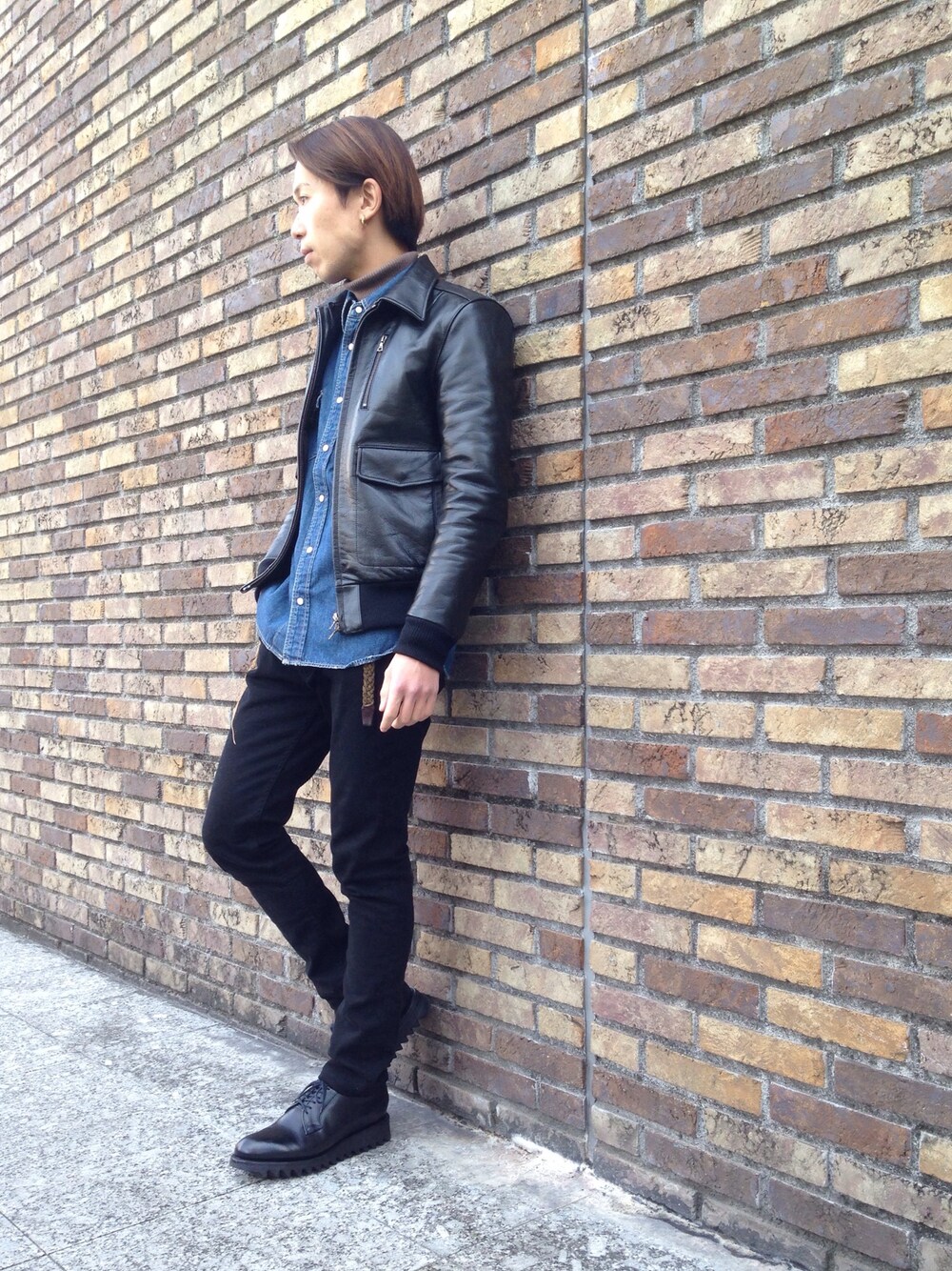 武骨さ漂うG-1ボンバージャケットを本日は着用。 革自体のクオリティの高さに加え、オイルを染み込ませた事で艶感がプラスされ洗練された大人な雰囲気をまとっていますね。 また、元々はブラウンの革を黒く染め上げ(2度染め)ているの為、経年変化でアタリ感が濃くみえてくる部分とそうでない部分とのコントラストが革好きの方々にはタマラナイかと。 服自体のインパクトが強いので、サイズ感・レイヤード加減・ヘアスタイル等いつも以上に気を遣わなくてはなりません。服って奥が深いです。深い深い深い〜 MR.OLIVE PRESS 手嶋 祐生