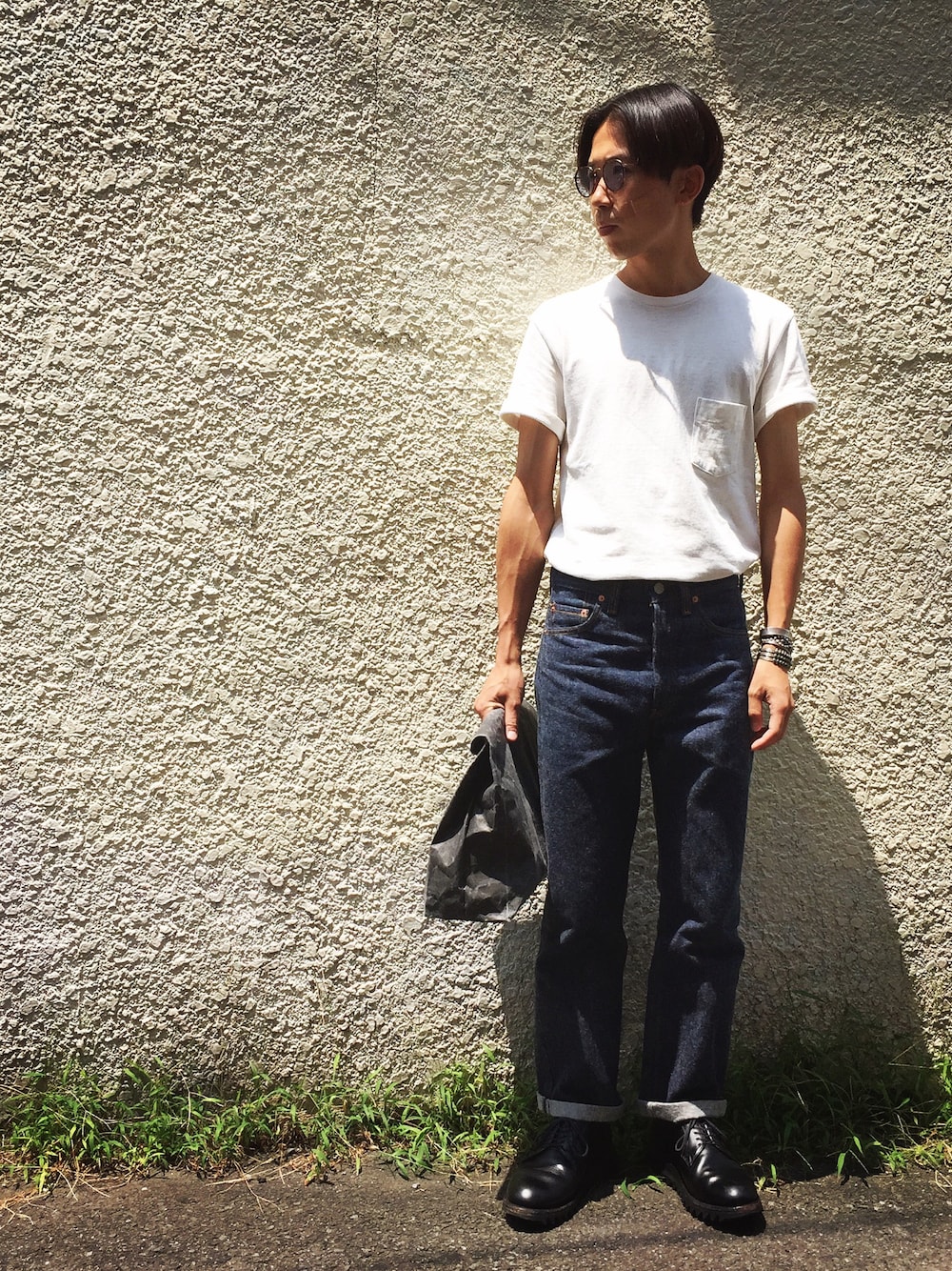 手嶋 祐生のTシャツ/カットソー「【MR.OLIVE】12/1 EMERALD PLAINSTITCH / ONE POINT CREW NECK T-SHIRT」を使ったコーディネート