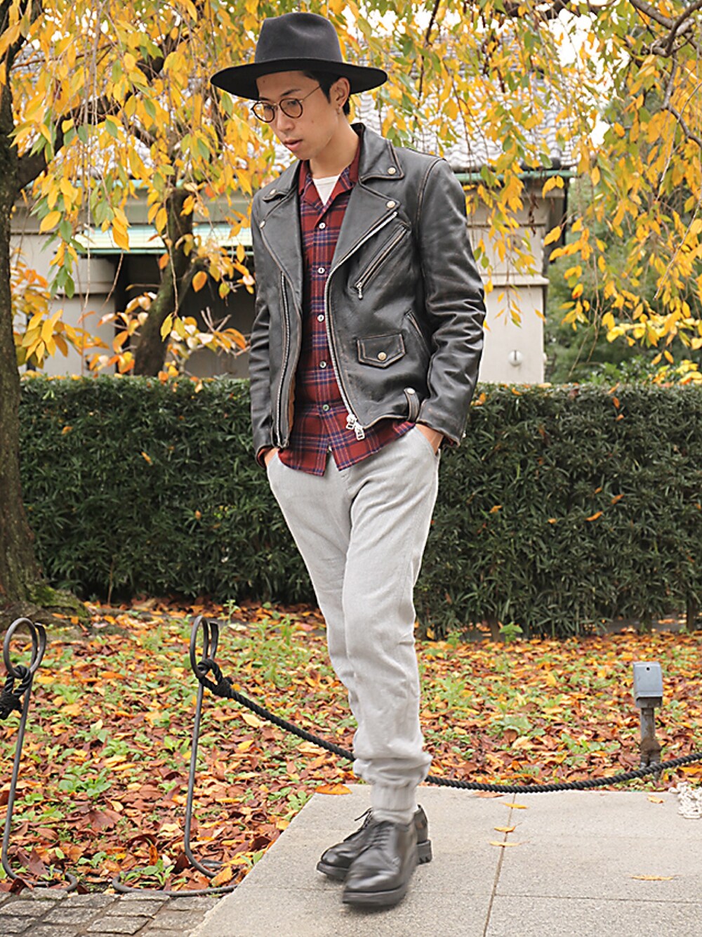 手嶋 祐生のライダースジャケット「TWICE DYED COW LEATHER / VINTAGE CRAFT DOUBLE SPORTS RIDERS」を使ったコーディネート