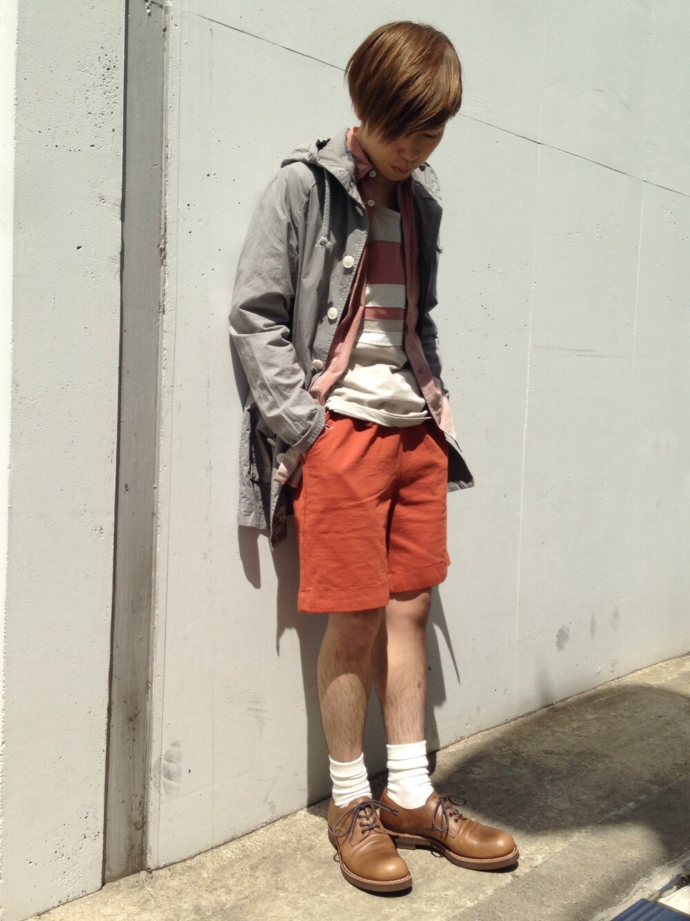 スプリングコートとショーツを合わせた春らしいコーディネート。差し色のブリックが新鮮。 *掲載されたアイテムは以下でもご購入できます。 店舗 : WALK IN CLOSET (T)03-5459-1885 公式サイト: http://walkincloset.jp/
