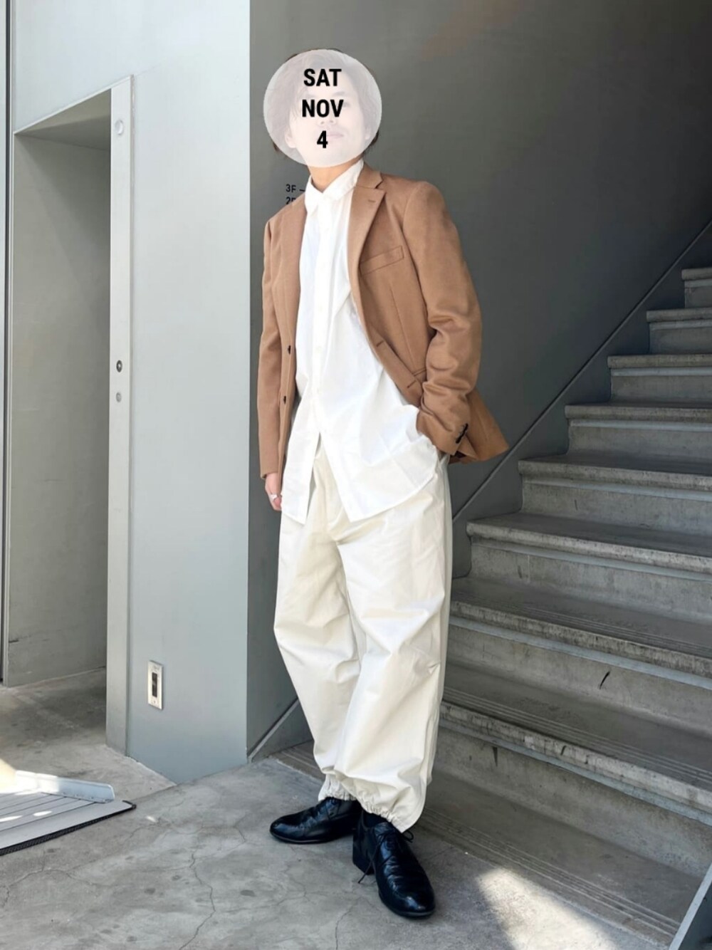 優しい起毛感のあるジャケットに ナチュラルなファティーグパンツを合わせて 上品なスーピマ生地のオーバーシャツを添えて 上品なミリタリースタイルコーデ