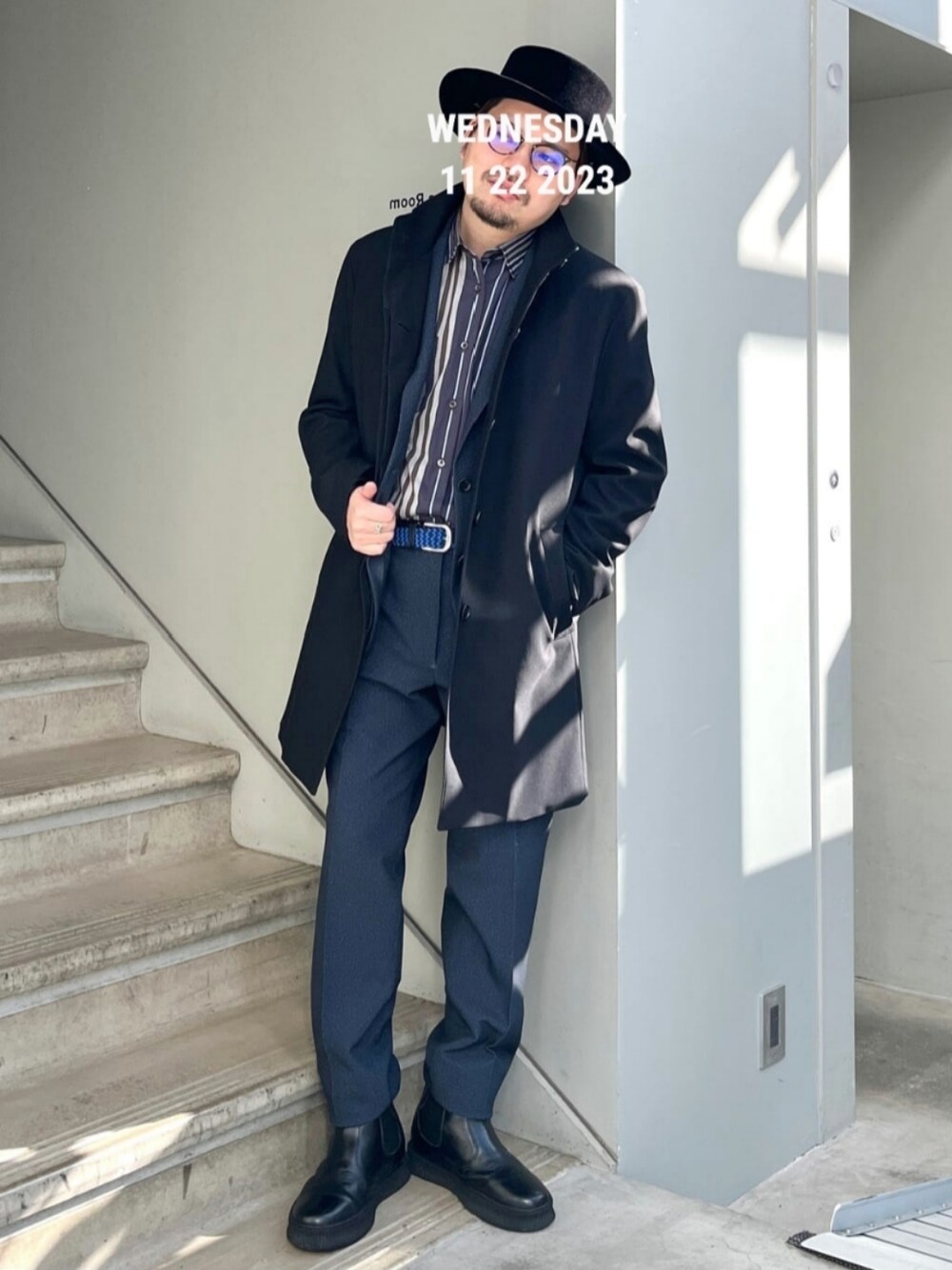 大人顔のコートに スラリとしたパンツを合わせて 起毛感のあるサファリハットを添えて コンクリートジャングル散策スタイル