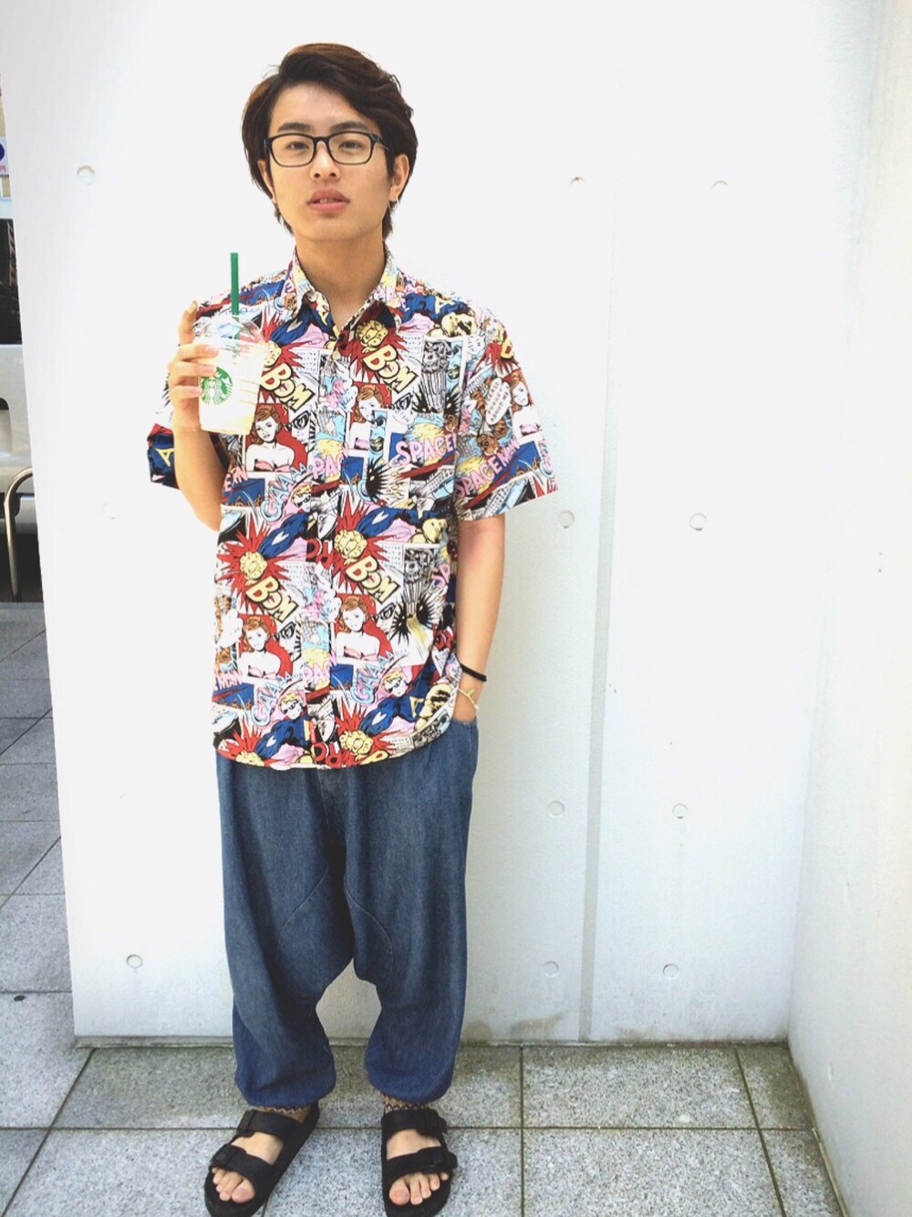 アメコミ柄アロハ サルエル サンダル というユルい服装に キチッと髪型をきめて テイストをミックス。