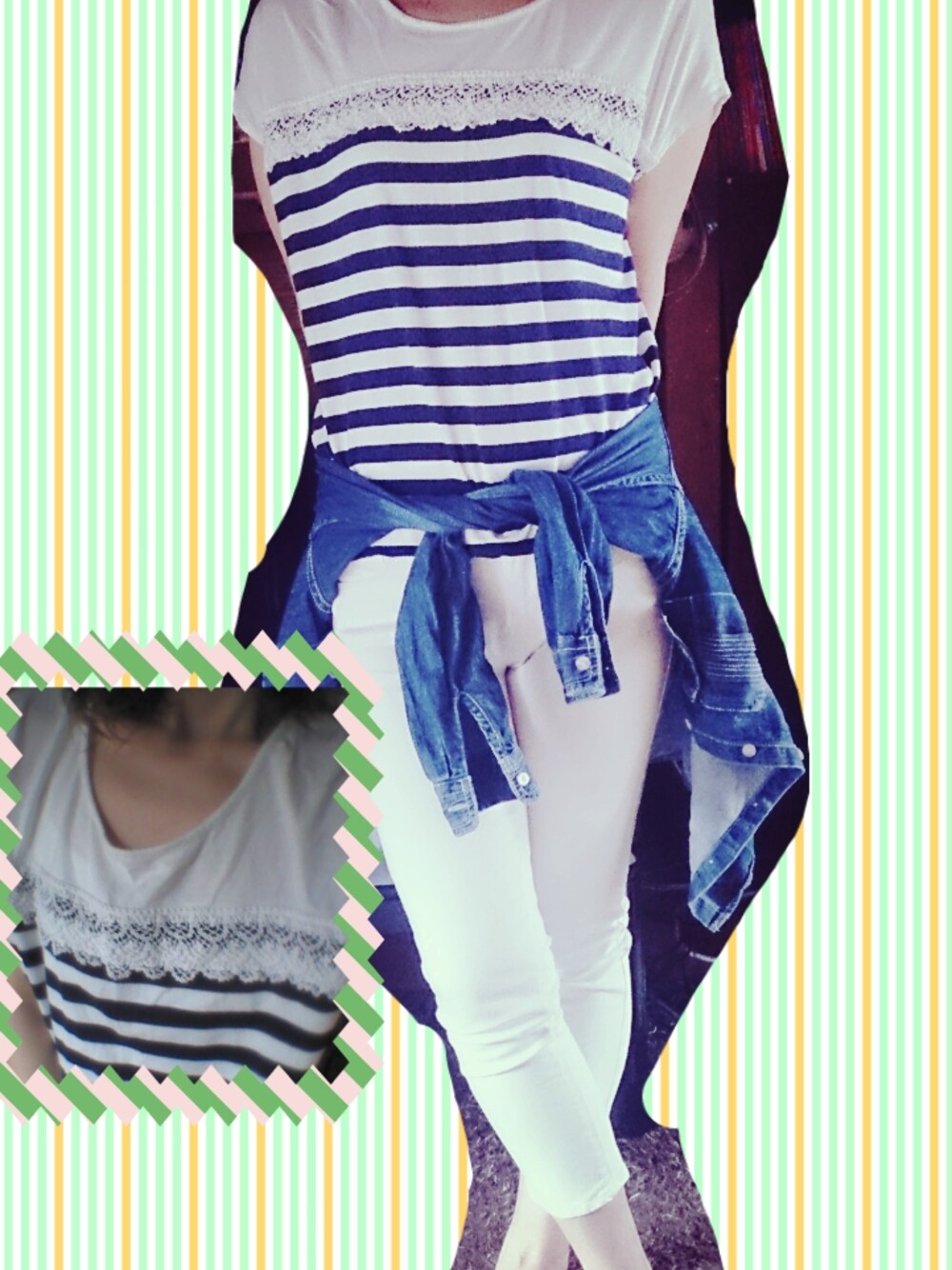ボーダー大好き(笑) ちょっぴりレースだけど。 白パンツはぽっちゃりの私には、かなり危険(。-∀-) デニムシャツで隠して。。。