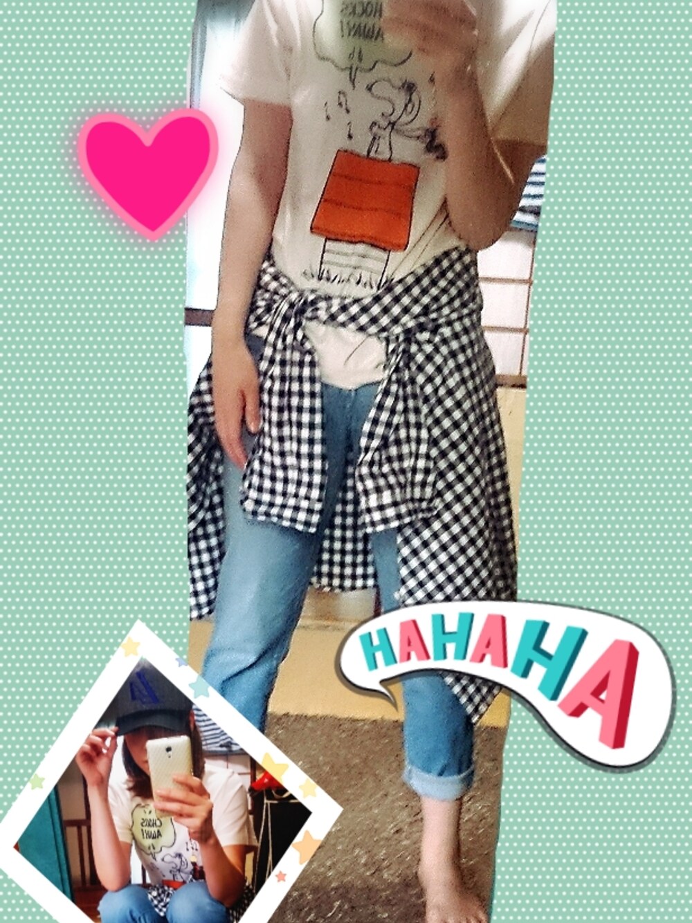 Tシャツ&デニム。。。 スタイルの悪い私には難しいコーデ( ´_ゝ`) このスヌーピーTシャツ☆ men'sだけど可愛いので購入しちゃいました♪ Sでもちょっとデカイ。。。 inするのには良いかも~!