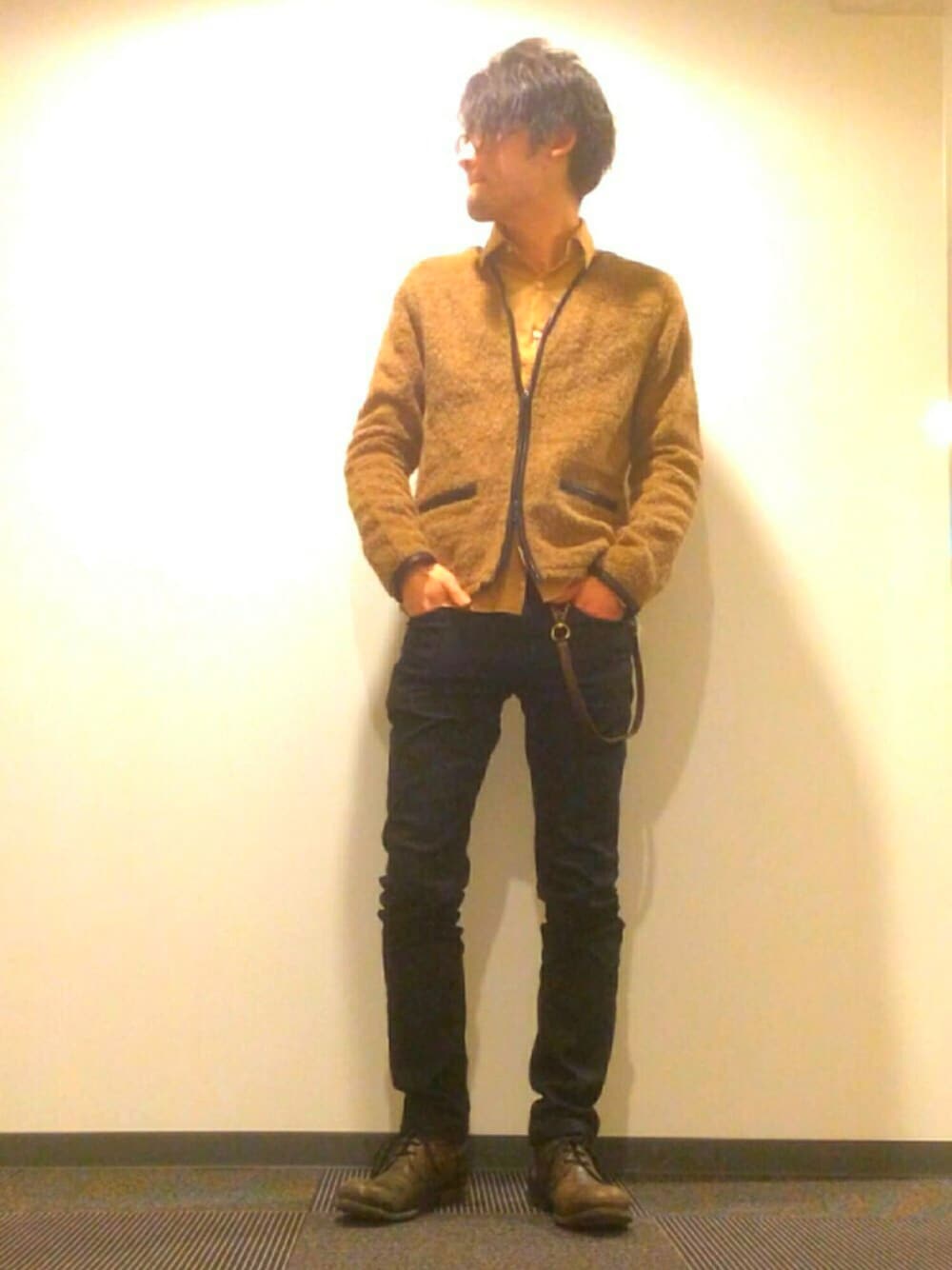 【毛×ブラックスリムパンツ】 これだけ読むと、ヤバイです。ド派手なロック野郎の登場です。 なので、きれい目な優しい色味のシャツでシンプルにきてみました。 この毛カーディガン?色んな重ね着で使えそうだけど、難しそだなー どうだろー?