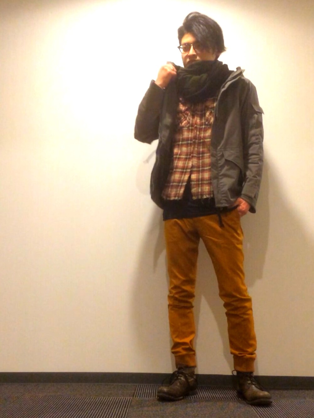 【色×色×ブラック】 カジュアルです。赤チェックシャツとマスタードパンツ。 このパンツ、スラックスなんですけどリブになってるんでブーツの上にクシュっとたまって雰囲気でるし、ブーツも見えるし使えます。 上下の色と色がごちゃごちゃしてますが、色のトーンを合わせてインナーや小物でブラックを効かせることでひきしめてみました。 黒インナー見せ、使えるっ
