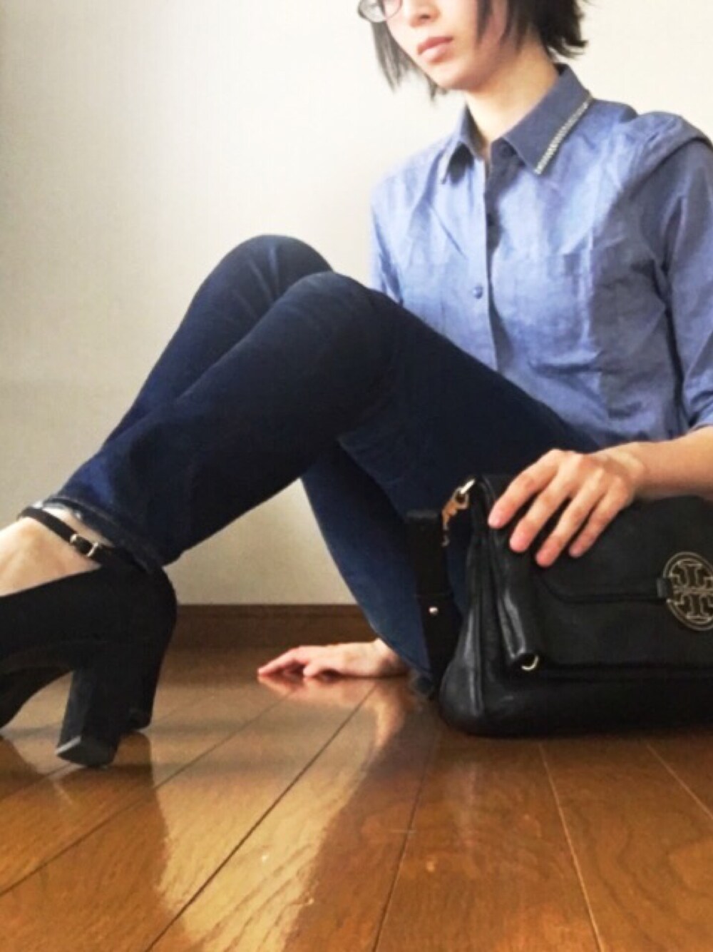 今日は雨☔️ こんな日は大好きなデニム!と思い デニム×デニム。 正確にはデニム風シャツ×デニム。 アズールのデニム履き心地良くて 好きです✨ 若干太ってキツイけども💦