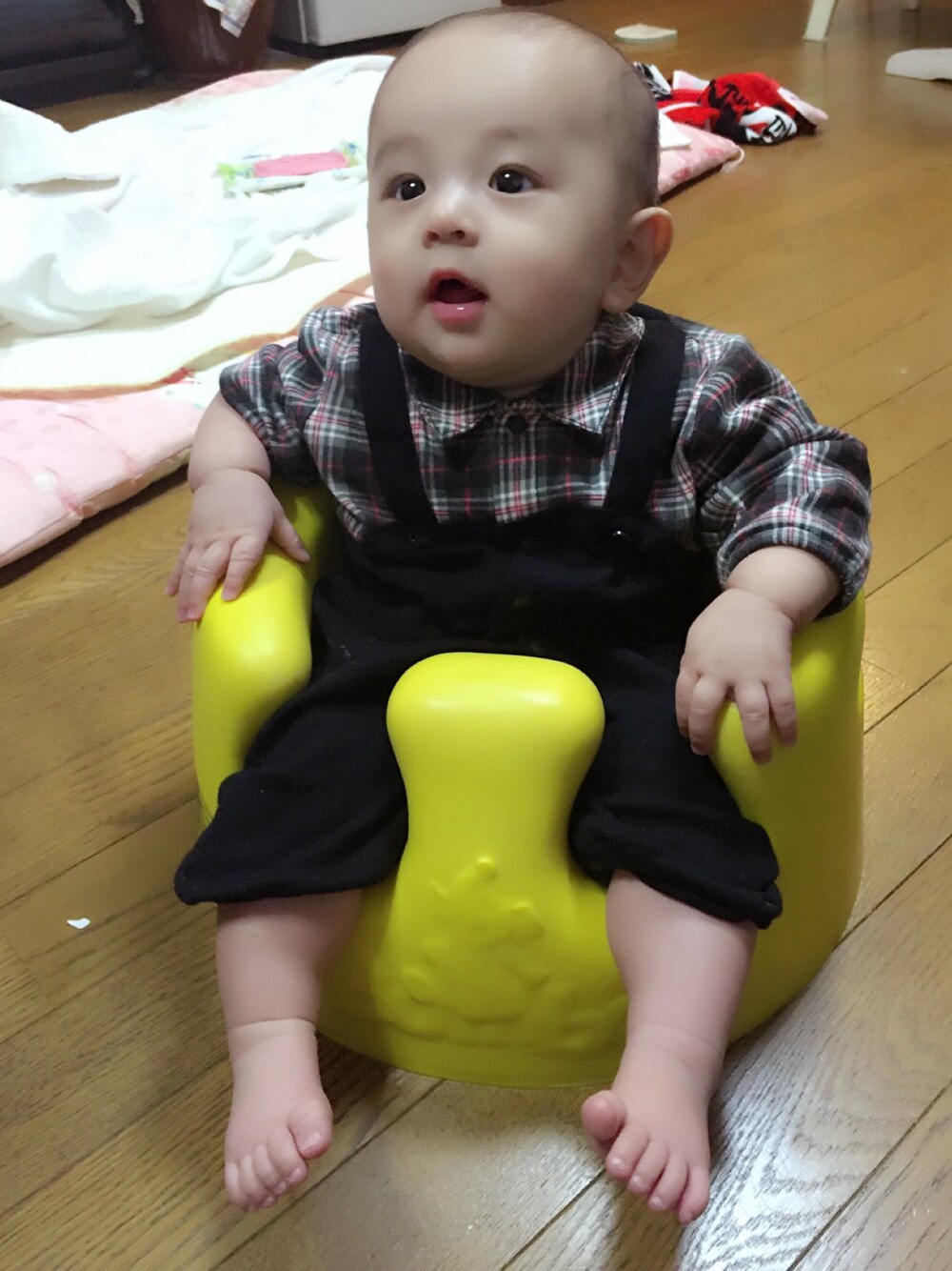 コムサのロンパースをいただいたので着用。 首がだいぶしっかりとしました。 太ってきてムチムチ! ムッチくんです!