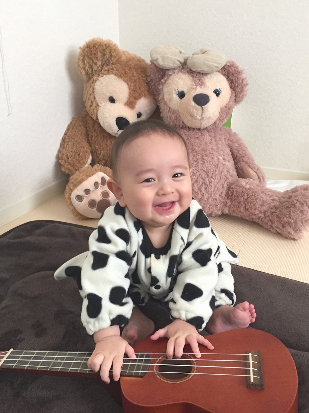 見ていただいてありがとうございます。 もう6ヶ月になりました!ダッフィー、シェリーメイにかこまれてウクレレをつかむ我が息子。 よだれが素敵でダイヤモンドのような輝きを放っております。