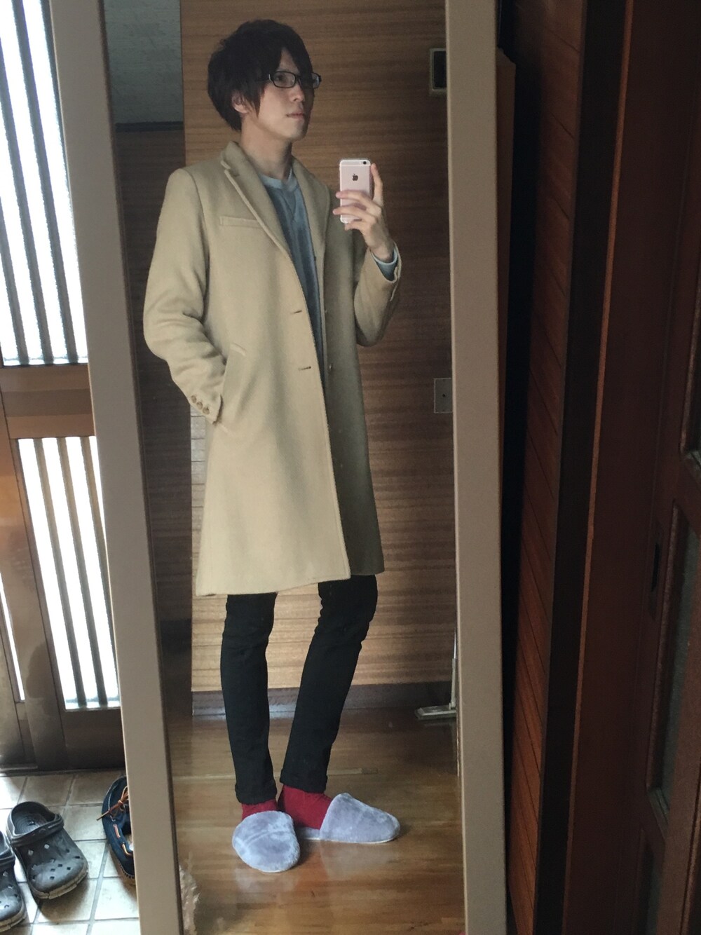 適当にあわしたので記録の保存として、アップ。トップスのインナーに白のタートルとかをあわせてもいいですね。!! 靴は、、はいてませんwwwww 汚れるんだもの!笑 みんなみたいに、靴乗り場作るか、、!笑 てか、僕もみんなみたいに、鏡ではなく、撮ってもらうとか、一人で撮ってもらった風に撮影がしたい!!、