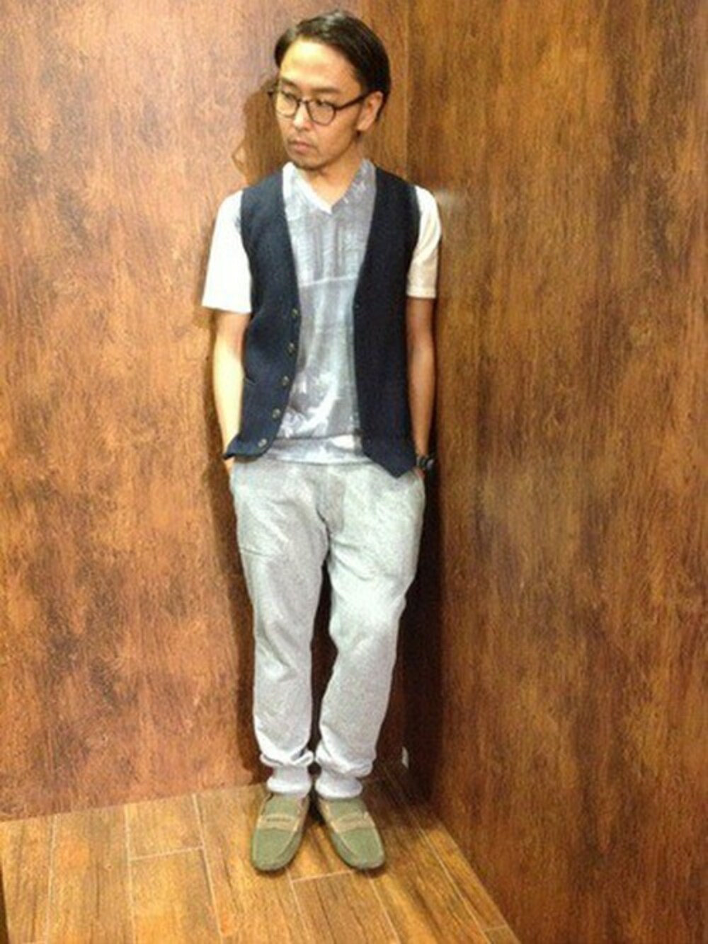 Tシャツとスウェットでラフなスタイリングにジレを羽織ってメリハリを! 差し色にローファーはカーキで。