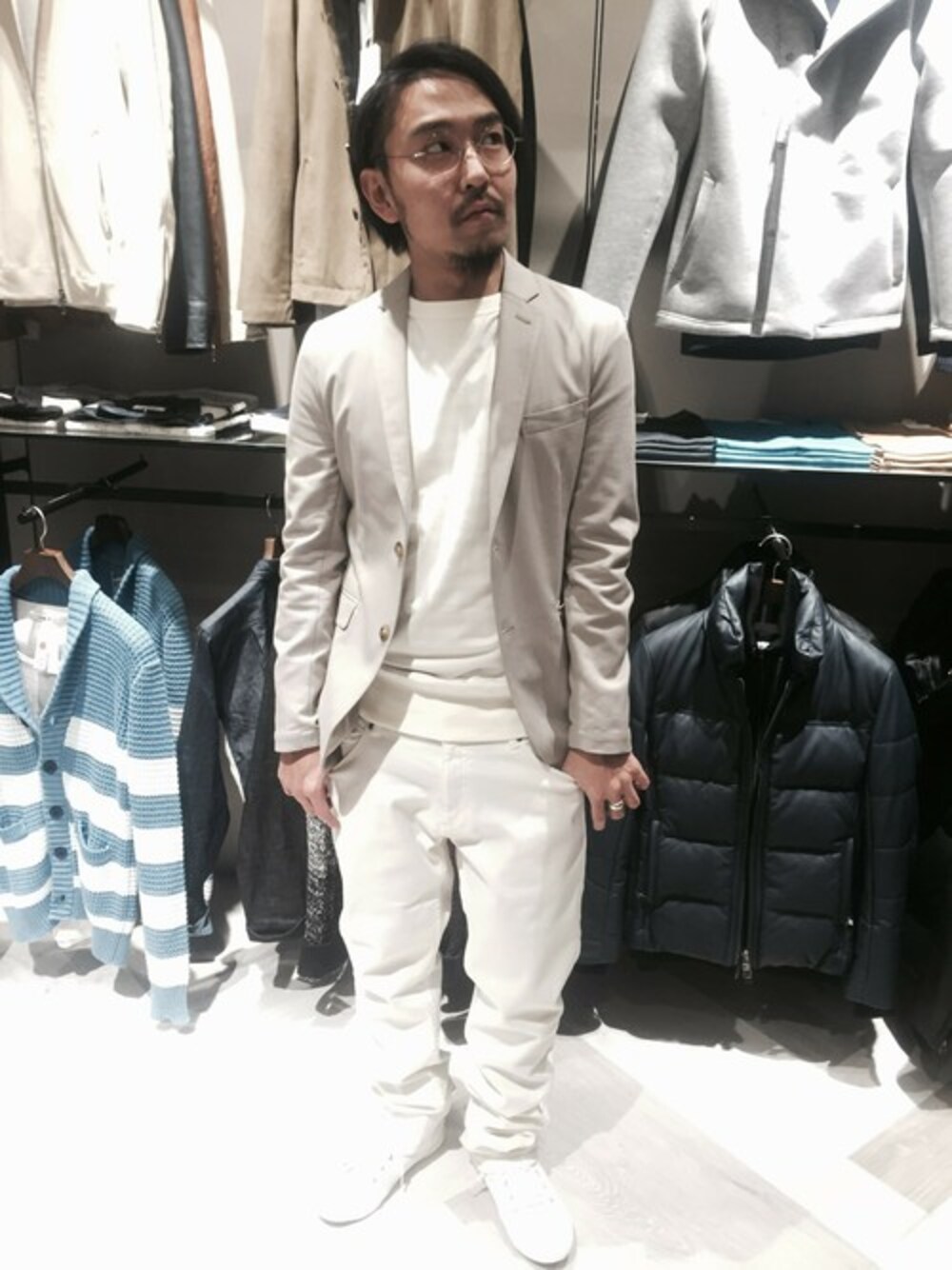 今年トレンドのオールホワイトコーディネート。 真っ白過ぎないようにジャケットはアイボリーで大人のスタイリングに。