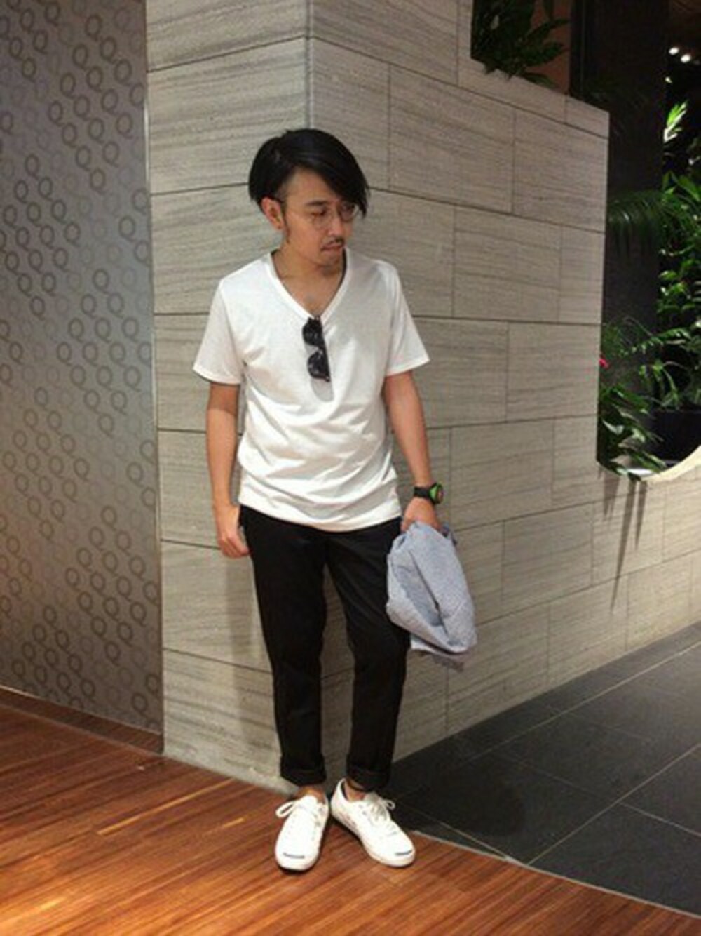 サマーモノトーンのベーシック! ブラックパンツに白Tでシンプルに。 マイブームのダブルアイウェアもポイント!