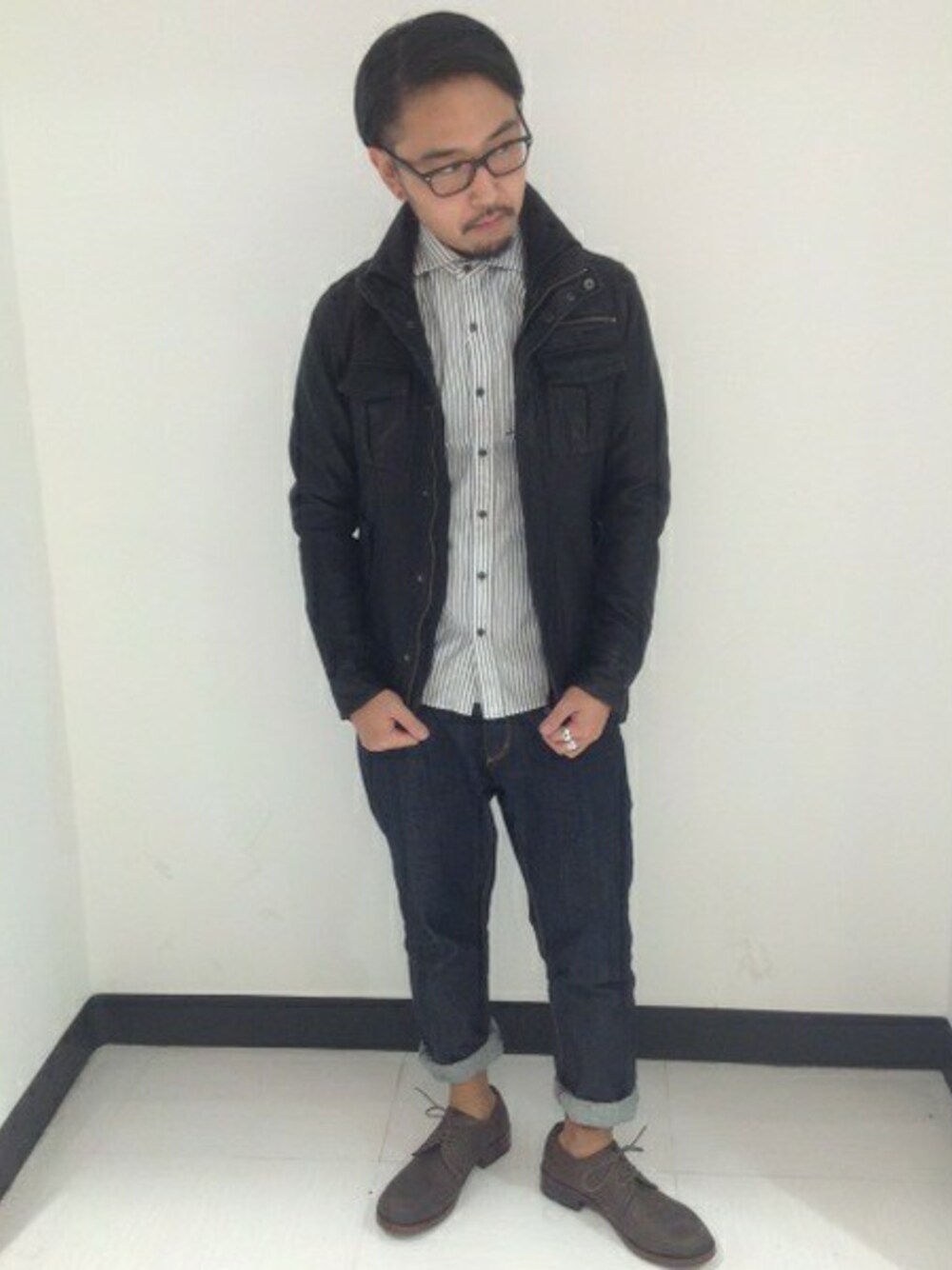 無骨なレザーとシューズをストライプシャツとロールアップでスタイリッシュなコーディネートにしてみました。
