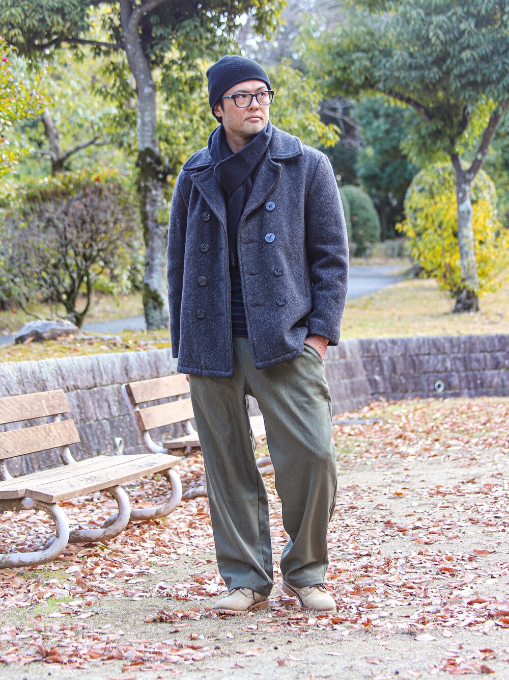ちょっとウール系が続いてますが😅 今ピーコートの良い組み合わせを模索中。 普段滅多に使わないストールなんかも使ってみたり。 パンツの淡いグリーンが木々の緑とマッチします🌲 足元はRW8167 ソールカスタムしてからちょっとワイルドになった感じ。気に入ってます☺️