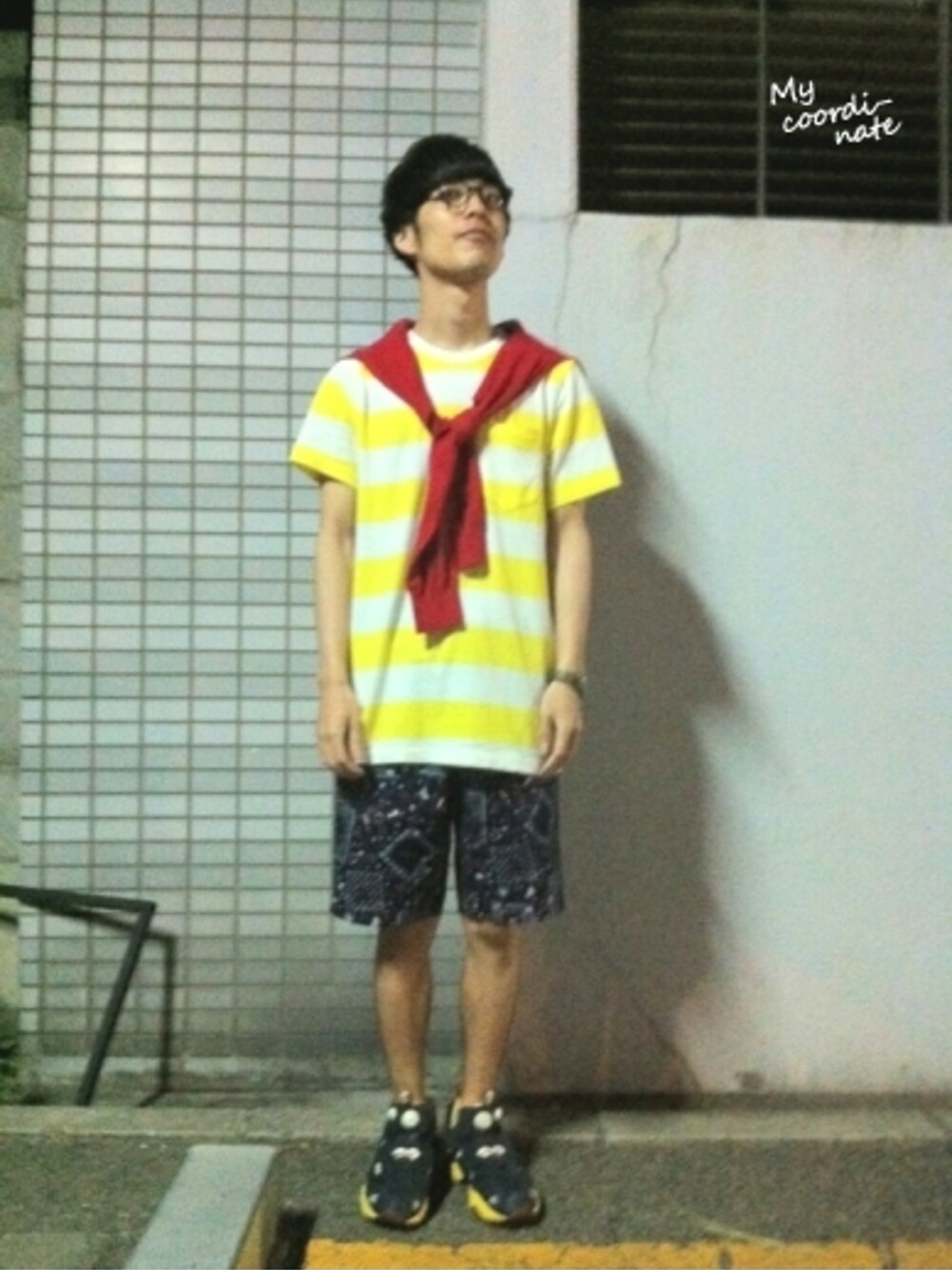 トンボ再びw 最近全然投稿できなくてすみませんww 最近写真を撮るタイミングがなかなかなかったんですよね・・・ あとコーデのストックもなくなってきているのもありますねww でも出きり限り載せていきたいと思いますので、これからもみなさん宜しくお願いいたします!! ということで、今日はトンボコーデの再来ですねww 前は赤ボーダーだったんですが、今回は黄色ボーダーでトンボ君とは逆の色使いですね!! このM.NiiっていうブランドのTシャツは結構着心地も良くってオススメです♪ M.Niiはもともと44年前にブランドを廃止し去年リバイバルされたサーフブランドなんです!! なので下のショーツもマリン柄のショーツで海を意識しました♪ これで僕も海の男になれますかねww ビバ海の男!!