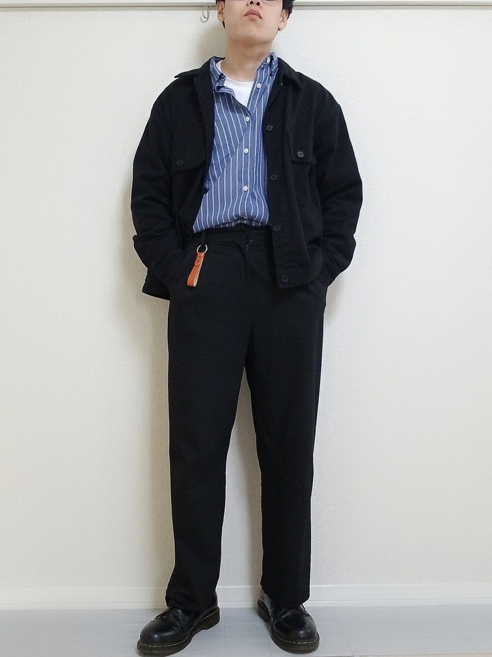 今回は、爽やかな青のストライプ にCPOジャケットとワイドパンツ を合わせ、決めすぎず程よいキレ イめコーデにしました!✨ ポイントは、ワイドパンツにする ことで程よくゆとりを持たせて、 ワンポイントのキーホルダーで色 の単調さをカバーしました✌️