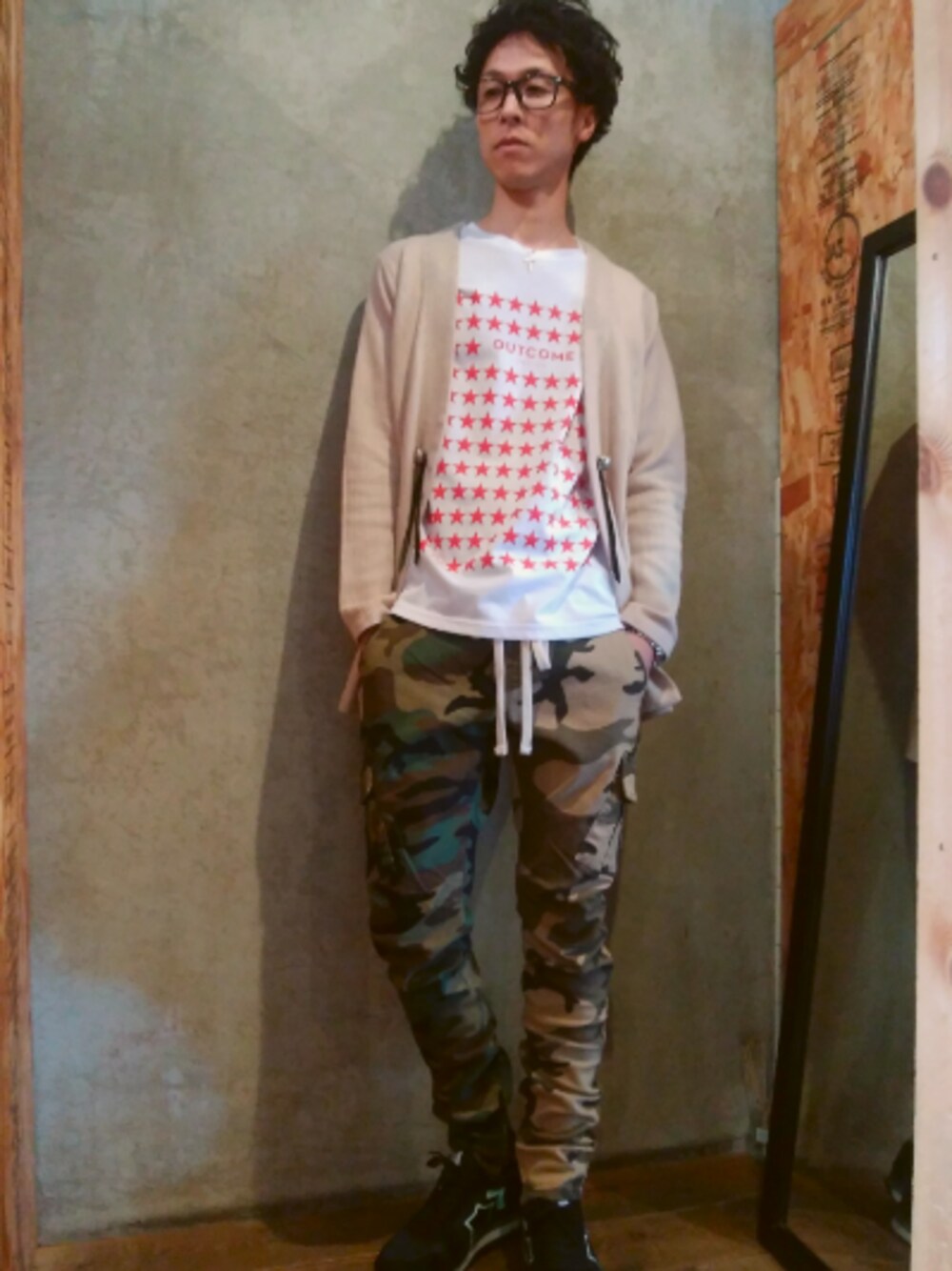 お客様の 春用スタイルです! mnmlの左右アシンメトリーな カモフラカーゴは 個人的にも好きな いいアイテムですが、 癖の強いアイテムなので、 それ以外はシンプルに まとめた 綺麗な春スタイルかと!