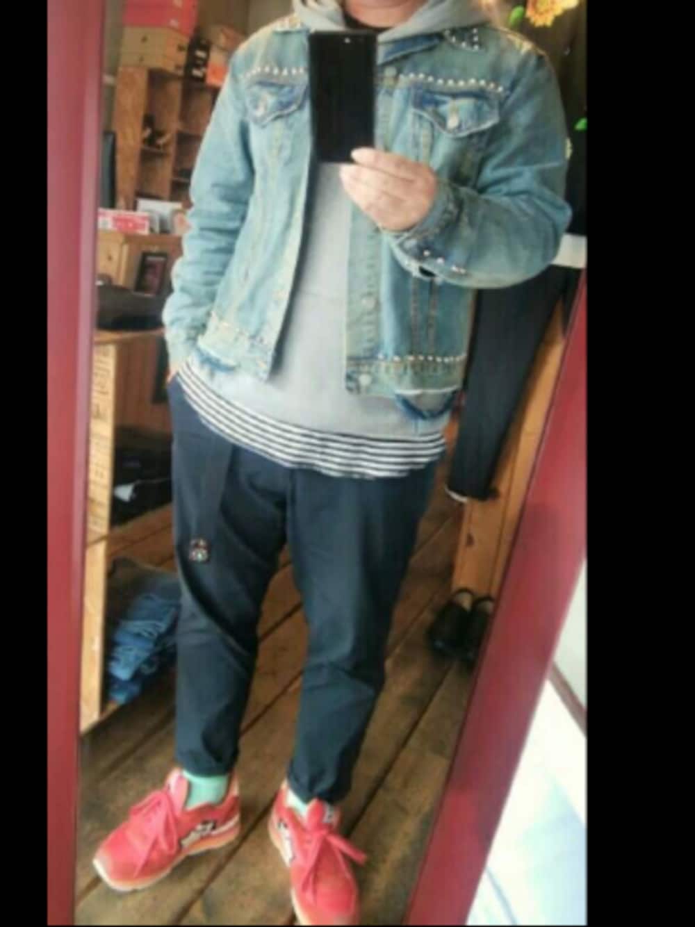 春ですが、 肌寒かったので Gジャンとパーカーの スタイルになります! 足元のみ 派手なカラーで シンプルに まとめてみました!