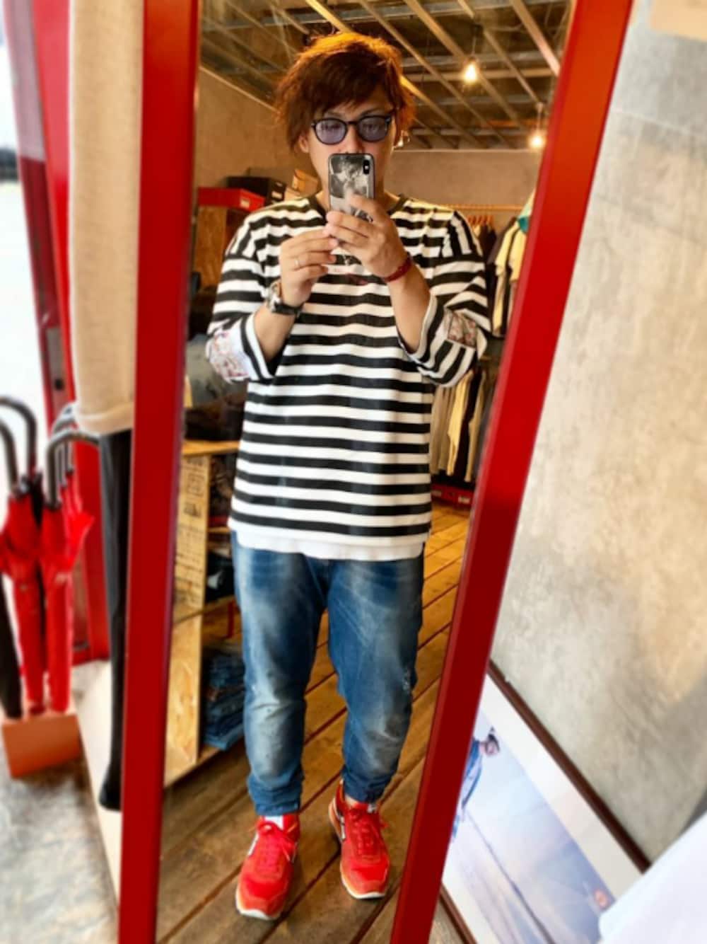 夏スタイル! お客様スタイルです! ボーダーを少しゆるく着て、 ロングカットソーレイヤードで ベロ出しスタイルを! デザインある トップスをデニムと カラーの派手なスニーカーで まとめたスタイルです!