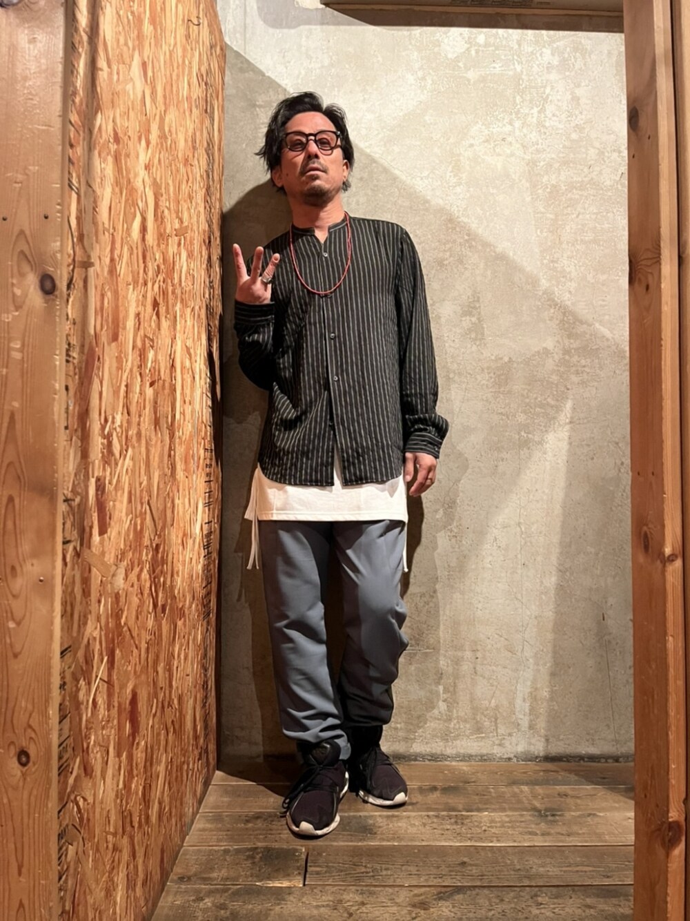 ストライプシャツと 独特のカラーのパンツの合わせ! 2023年 S/Sの PLUSALPHAオススメスタイルです。 レイヤードした タンクトップが ポイントです!
