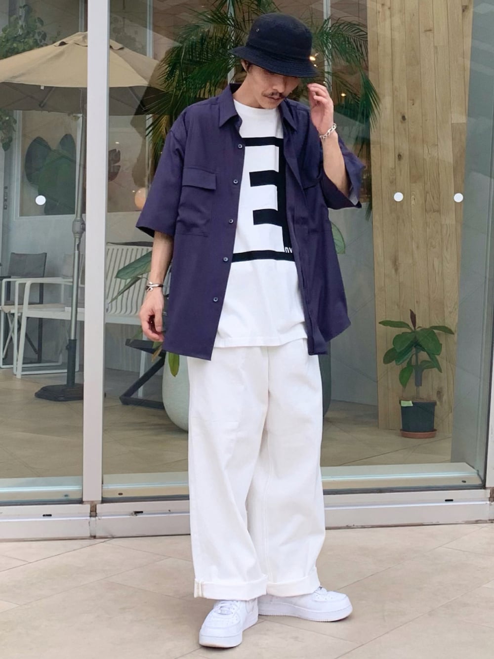 ドレープCPOシャツ✖️【taixJUNRed】 デニムワイド2ロールアップパンツ 新作のドレープCPOシャツを着用し夏のモードストリートスタイルをご提案。 綿素材のデニムと化繊ドレープシャツの異素材の組み合わせが◎