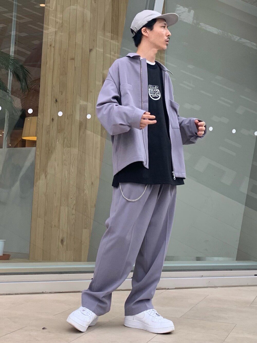 テクスチャーTRセットアップ✖️グラフィックルーズロンTEE 秋のストリートセットアップスタイルをご提案^_^ セットアップの綺麗なカラーを引き立たせる為にその他のカラーはモノトーンカラーでまとめました。