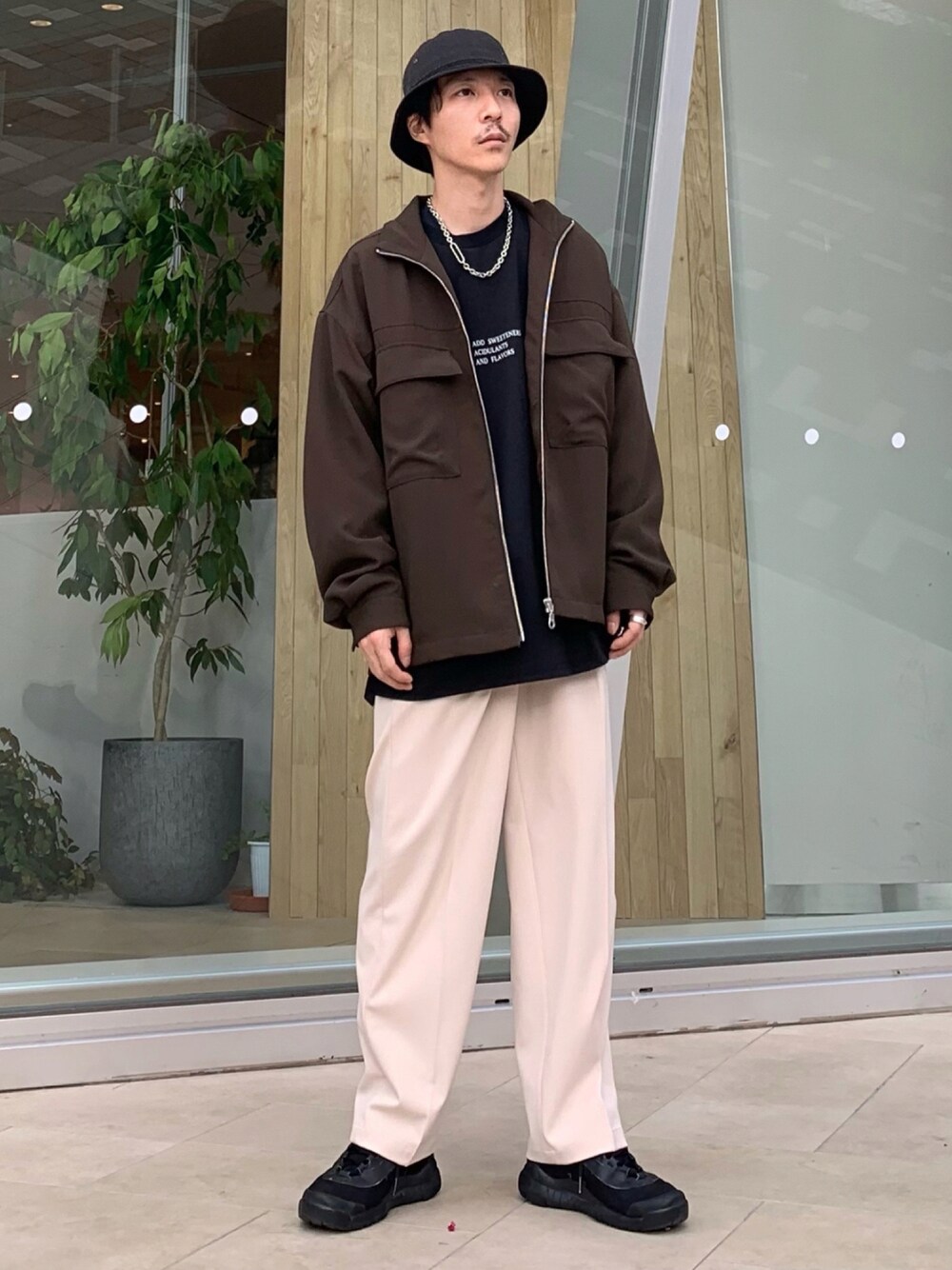 スタンドカラービッグCPOブルゾン✖️テクスチャーワイドパンツ 新作のスタンドカラービッグCPOブルゾンを着用し秋のラフスタイルをご提案。 一見ベージュとブラウンカラーのクラシックな組み合わせですが、シルエットが今季らしく、これからの時期に重宝しそうです